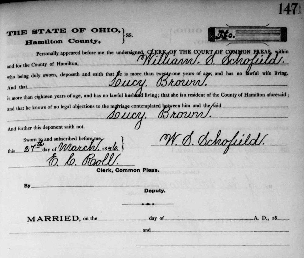 - Lucy A. Brown, b. ~1829 in Anderson Twp., Hamilton Co., Ohio, m. William S. Schofield on or after March 27, 1846 in Hamilton Co., Ohio (see marriage record).
