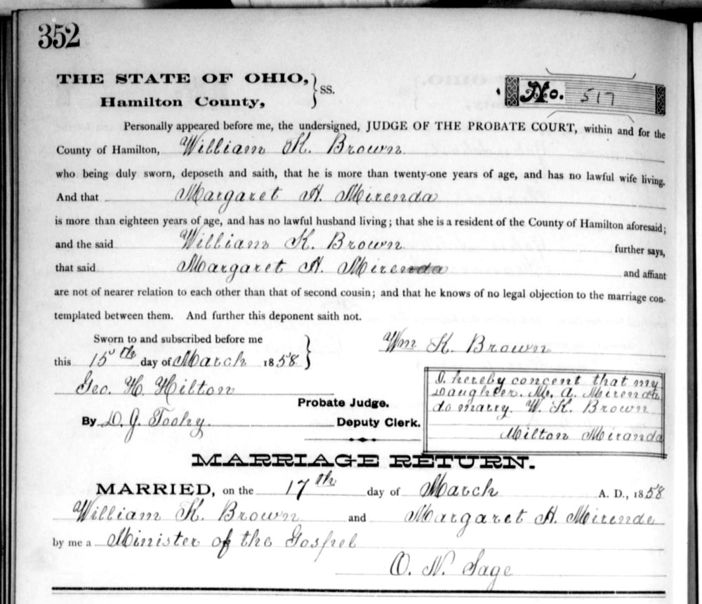 - William K. Brown, b. 1833 in Anderson Twp., Hamilton Co., Ohio, m. Margaret H. Mirenda on March 17, 1858 (see marriage record), d. Aug. 24, 1864 at Drummondtown, Va.