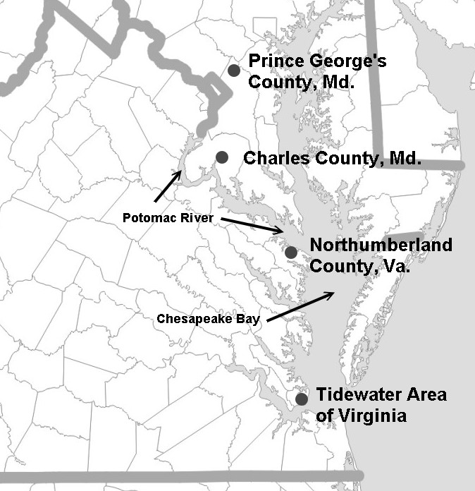 So, what's the bottom line based on this research? We believe Rosamond Prewtt had a relationship with one of the Northumberland Swanies (who were likely related to the Tidewater Swenys) which led to the birth of her son Samuel on February 1, 1700. The Northern Neck region of Virginia, which includes Northumberland County, was a huge tobacco growing area. The ports could be the first stops for ships coming from England and the last stops for their return voyages to England. The predominant business of plantation owners and lessees around the Chesapeake Bay and Potomac River was the production of tobacco. The Potomac River was a highway to and from the tobacco plantations in Virginia and Maryland. Just up the Potomac River from Northumberland Co., Va. was Charles Co., Md. where an extended family of Fitzgeralds were producing tobacco. This may explain why Morris Fitzgerald was in Northumberland County in the early 1700s. A Morris Fitzgerald died in Charles County around 1711. We believe this may have been the father or a cousin of the Morris Fitzgerald who appeared in both Northumberland County and later in Prince George's County. We believe Morris or one of his relatives married Rosamond and that they traveled upriver to Prince George's County in search of land where they could grow and sell their own tobacco. This migration brought Samuel Pruitt to the area where the Hocker/Hawker family lived and where he met and married Elizabeth Hawker around 1720.