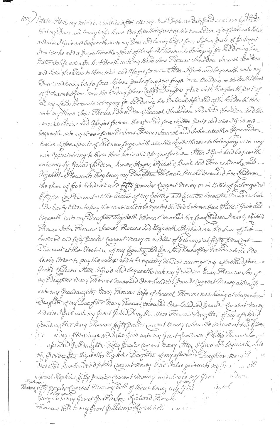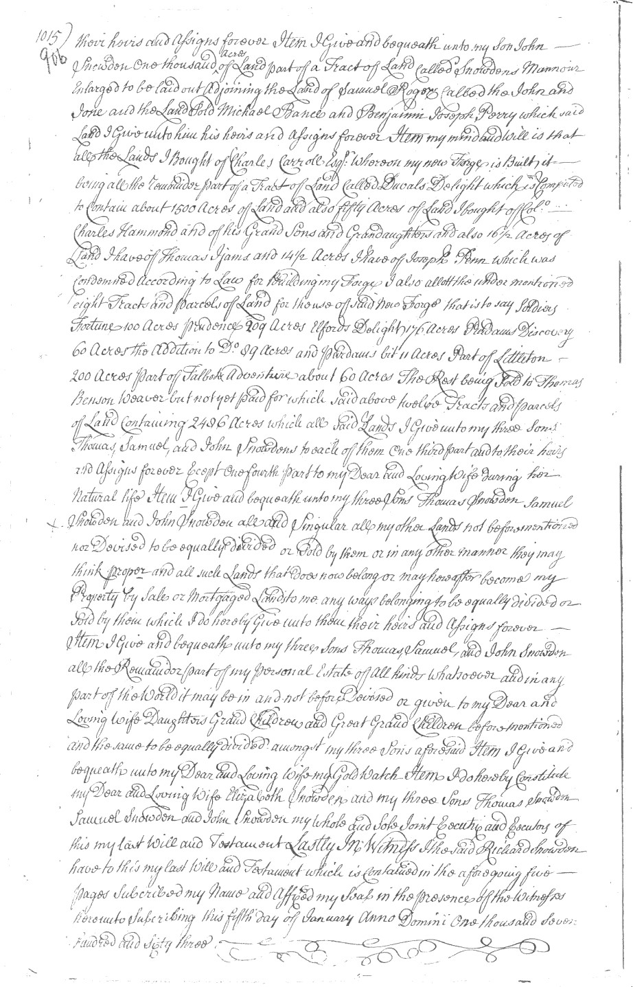 The Pruitts did not leave much of a footprint in Maryland records in the early to mid-1700s. Only one Pruitt marriage record has been found so far, Priscilla Pruitt's marriage to William Duvall (see this 1940 transcription of the Rock Creek parish church record). Some lists of children for Samuel and Elizabeth Pruitt include Patience and Mary. We do not include them here because we are confident they were born to other Pruitts in Maryland. The only other records uncovered so far are the 1733 List of Taxables in which, among others, Samuel Pruitt, Nicholas Hawker and Philip Hawker appear. Other records are Samuel Pruitt's 1737 lease agreement, his 1760 last will and inventory documents which appear on Pruiett, Part 2. With this in mind, there is a question that's been raised by some researchers as to whether Margaret Pruitt existed and whether she or a Margaret Snowden married Philip Hocker. Since no marriage record has been found, we have to rely on Philip Hocker's last will, a deed recorded in Frederick Co., Md. and Richard Snowden's last will to make a subjective determination. The primary (and perhaps only) argument in favor of Philip Hocker marrying a Margaret Snowden is the fact that he left his son, Nicholas Hocker/Hawker, more than one hundred acres of a tract of land called Snowden's Manner [Manor] Enlarged. We believe researchers originally deduced that his wife must have been a Snowden for him to possess this tract. Now we know that he purchased the land, "part of a tract of land called Snowdens manor Enlarged," from Thomas, Samuel and John Snowden in 1769. From Richard Snowden's 1763 last will, we know that his three sons, Thomas, Samuel and John, inherited Snowden's Manor Enlarged, along with many other properties, from their father and chose to sell a part of that property to Phillip Hocker who also had bought another parcel from Richard Snowden earlier. From that will, we also learn that Richard Snowden's daughter Margaret had married a John Contee (see Page 3 of last will) around 1744, the same timeframe in which a Margaret had married Phillip Hocker. While this removes the principle argument in favor of Phillip Hocker marrying a Snowden, it does not prove that Margaret Pruitt was his wife. Some researchers have indicated that Philip Hocker's son, Samuel, was named Samuel Pruitt Hocker, but we have not seen a record that substantiates this claim. At this time, we believe the weight of evidence points away from Philip Hocker marrying a Margaret Snowden, and we have tentatively determined that the evidence points towards Margaret Pruitt. As always, this kind of determination is subject to change as more evidence comes to light. Certainly, the geographic proximity of the two families, as the 1733 List of Taxables suggests, makes a Hocker-Pruitt union a plausible presumption, even though Philip would have been her first cousin, once removed. It's of interest to note also that even though Margaret (Pruitt) Hocker was not mentioned in her father's last will (only three of the six children were mentioned), his 1765 estate inventory listed Philip Hawker under "nearest akin" (related by blood).