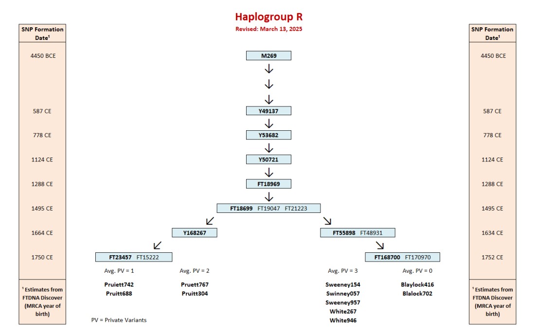 Who was the common ancestor of our thirteen testers? We are confident that the four Whites in our test group are descended from Moses Swinney, born before 1717. Based on deed and land records, we know he lived in Edgecombe Co., N.C. as early as 1738 and then appears to have died in Granville Co., N.C. in 1754 based on estate records recorded that year. Granville County was formed out of Edgecombe County in 1746, so it's possible that Moses Swinney didn't actually move from one county to the other. At least two of his sons, Littleberry and Cajabeth, took their stepfather's surname of White. We are very confident that all of the White testers descend from two or more of Moses Swinney's sons who took the White surname. Based on this, we know the Whites are really Swinneys and likely descend from the same ancestor as our Sweeney/Swinney testers. Does this mean that Samuel Pruitt also descends from a common ancestor with the Sweeneys and Whites? The short answer is yes. SNP testing performed through FTDNA's Big Y test confirms that our eleven testers who have taken the Big Y are descended from a relatively recent common ancestor based on the fact that they share the SNP FT18699 (and its equivalents - FT19047 and FT21223), the earliest of which formed around 1495 CE. The SNPs that represent the beginning of the Sweeney/White/Blaylock line and the Pruitt line (i.e., FT55898 and Y168267) formed around 1634 CE and 1664 CE respectively. These years of SNP formation were calculated by Family Tree DNA's Discover program and are "based on SNP and STR test results from many present-day DNA testers." Thus, the split between the Sweeneys/Whites/Blaylocks and the Pruitts likely occurred in the mid to late 1600s based on these calculations. With more Big Y tests, we may see more refinements in the dates of SNP formation which will help us more precisely pinpoint the time period for the birth of the common ancestor for these family lines.