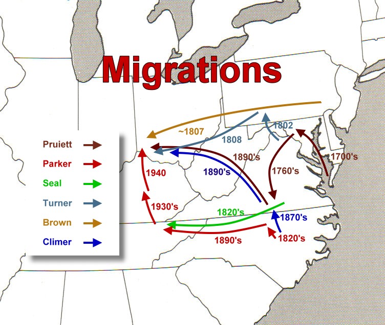 For long periods of time during the 1700s and 1800s, our Pruitt, Hawker, Climer, Seals and Parker ancestors lived within 50 miles of each other in south-central Virginia and north-central North Carolina. The Pruitts, Hawkers and other families had moved from the area just north of present-day Washington, D.C. to south-central Virginia in the mid-1700s where the Seals already resided. Later, the Seals moved to eastern Tennessee, as did the Parker family from north-central North Carolina. Some Climers and Pruietts moved to southwestern Ohio in the 1890s. Then, coming full circle, the families came together again when Esther Ruth Parker met Ralph Ellis Pruiett outside a bus station in Cincinnati during World War II. See Memories, Part 4, for Ruth (Parker) Pruiett's reflections on how they met, courted and married during the war.