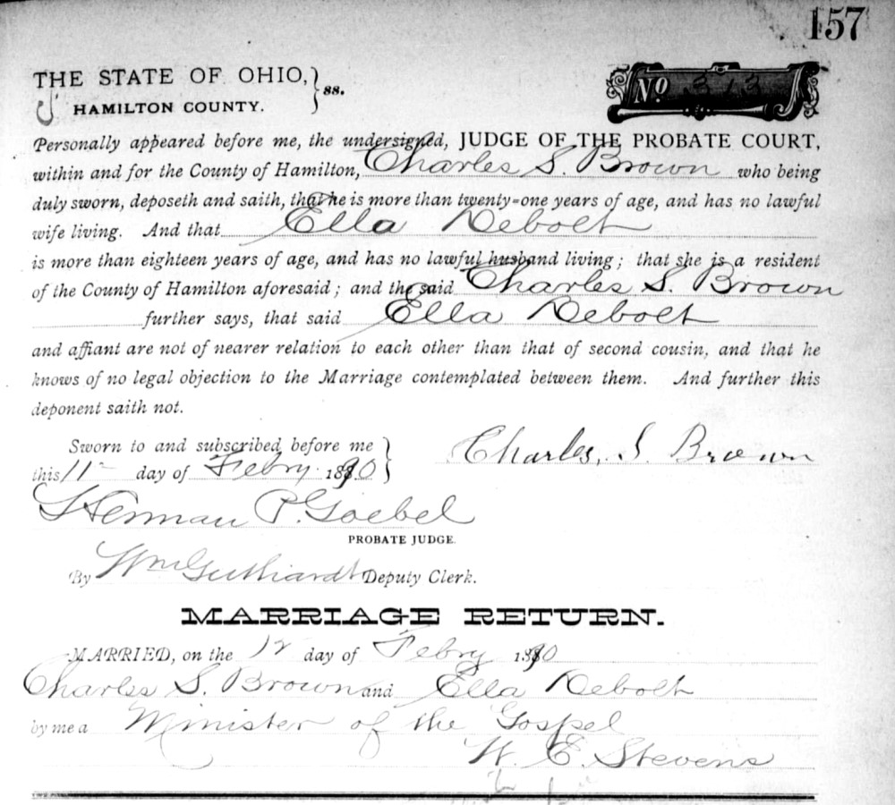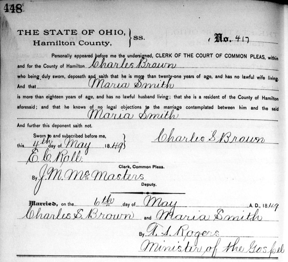 - Charles S. Brown, b. 1827 in Anderson Twp., Hamilton Co., Ohio, m1. Maria Smith on May 6, 1849 (see marriage record), m2. Ella Debolt on Feb. 12, 1890 (see marriage record), d. 1904.