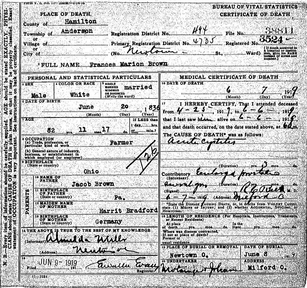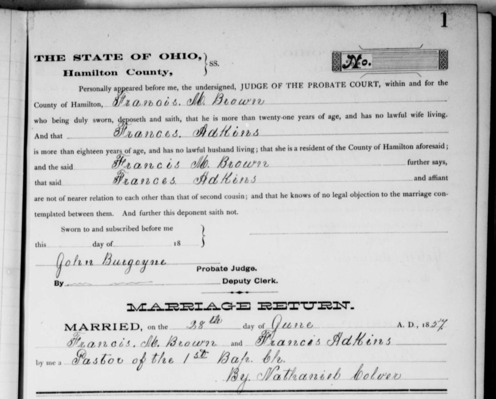- Francis Marion Brown, b. June 20, 1836 in Newtown, Hamilton Co., Ohio, m. Frances Adkins on June 28, 1857 in Hamilton Co., Ohio (see marriage record), d. June 7, 1919 in Hamilton Co., Ohio (see death certificate).