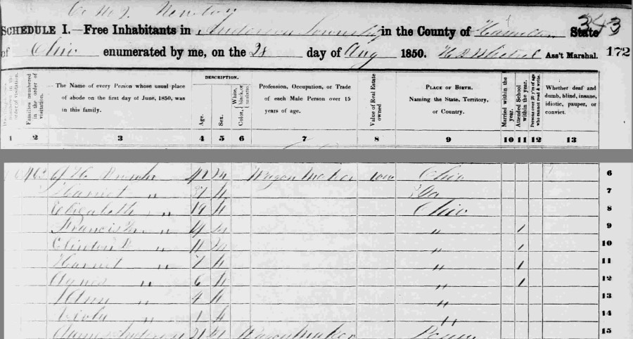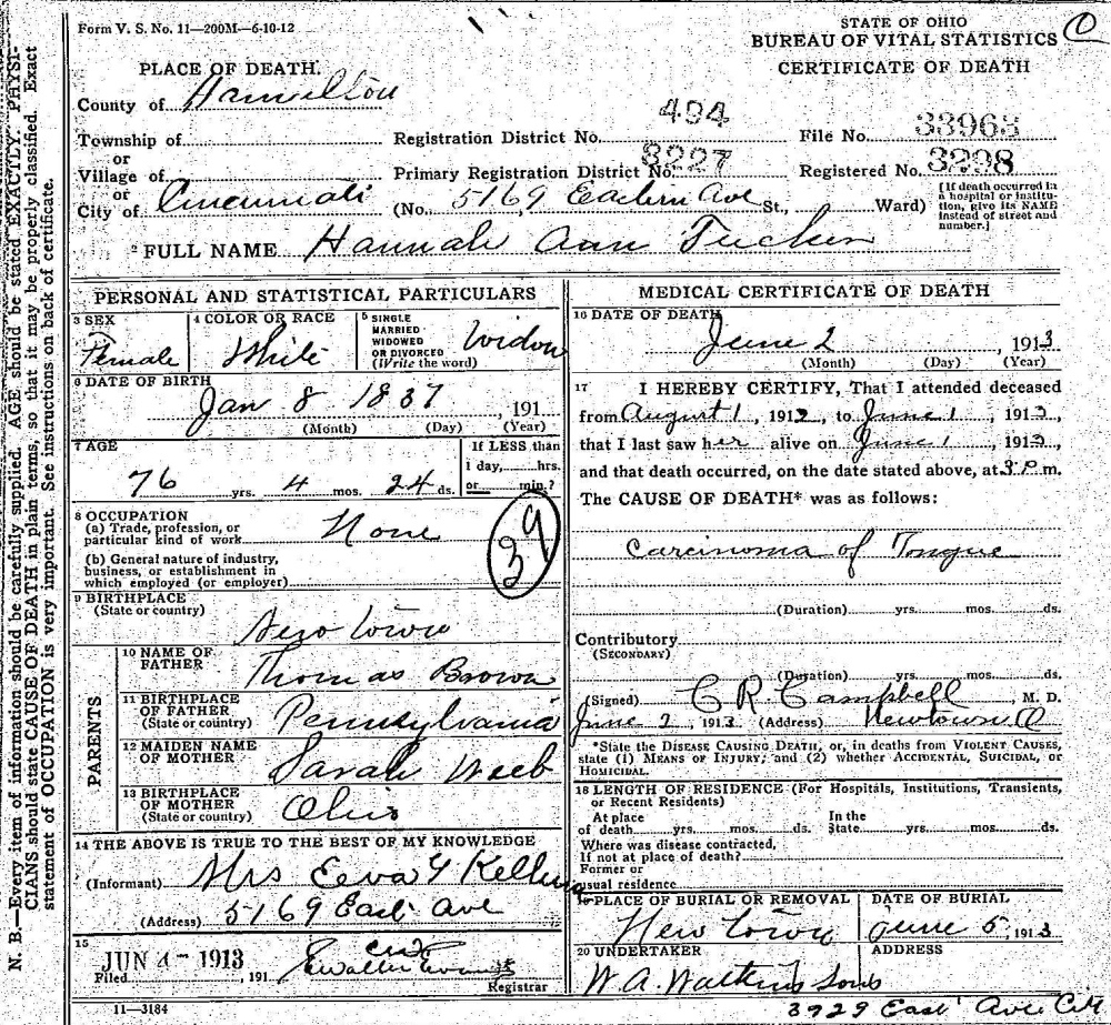 - Hannah Ann Brown, b. Jan. 8, 1837 in Anderson Twp., Hamilton Co., Ohio, m. John Tucker, d. June 2, 1913 in Hamilton Co., Ohio (see death certificate).