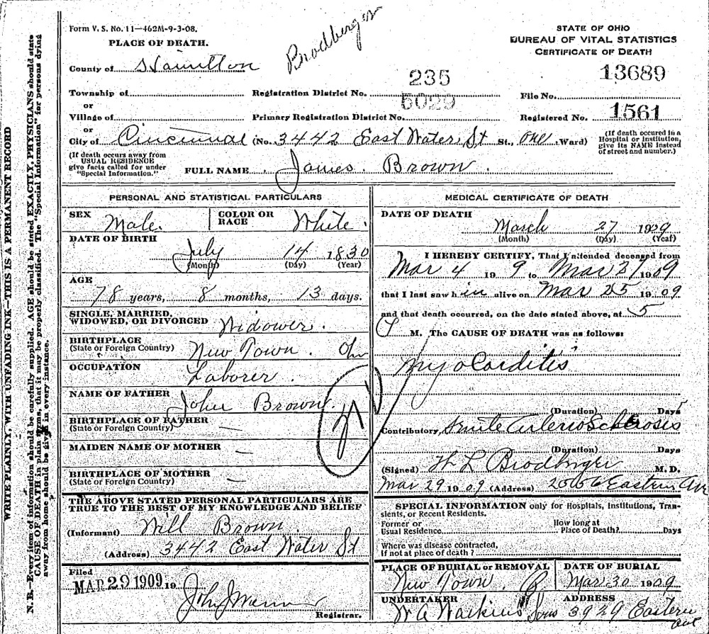 - James Brown, b. July 14, 1830 in Anderson Twp., Hamilton Co., Ohio, d. March 27, 1909 in Cincinnati, Ohio (see death certificate).