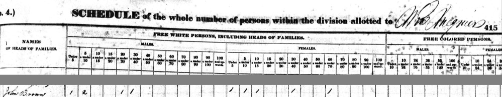 The 1850 census shows John Brown's wife as Ellener. She must have died within the decade because, by 1860, the eldest female living in his household was Rachel, presumably his wife. Also living in the household were two males who were likely his grandchildren:
