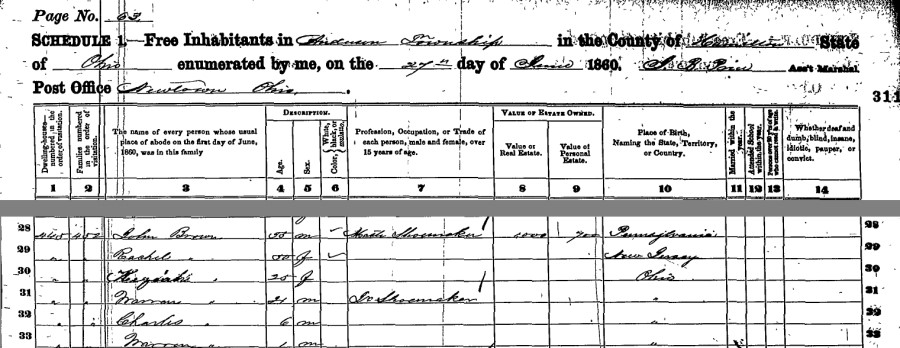 John Brown, son of Hubbard Brown, first appeared on his own in the 1830 census in Anderson Township, Hamilton Co., Ohio. He was listed as age 20-30. There was a female, presumably his wife Eleanor, age 20-30, living with him. There were two males living with him, one under age 5, probably Thomas Brown who was born around 1830, and one age 10-15. The latter was probably not his son since he would have been born when John Brown was age 15 or younger. There was also a female under age 5 living with him. By the 1840 census, John Brown and his wife were listed as ages 30-40. In the household was one male under the age of 5, two males, age 5-10, and three females under the age of 15. They also had a male, age 20-30 and a female, age 60-70 living with them. The 1850 census and the 1860 census begin to help us put names and birth years to the children of John and Eleanor (Armstrong) Brown: