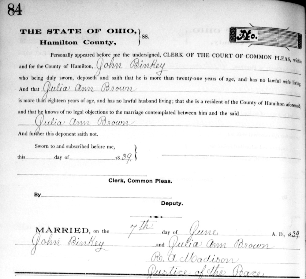 - Julia Ann Brown, b. ~1823 in Anderson Twp., Hamilton Co., Ohio, m. John Binkey on June 7, 1839 in Hamilton Co., Ohio (see marriage record).