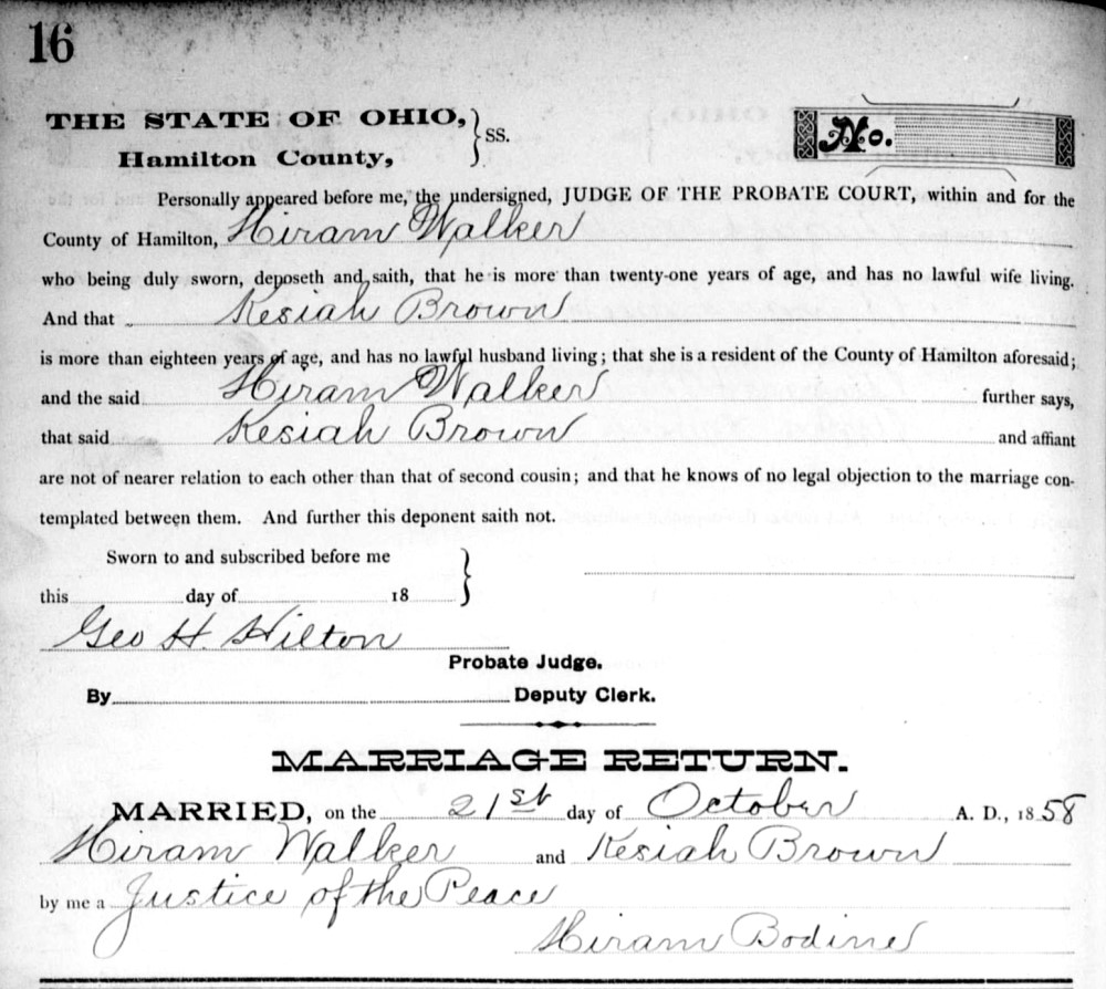 - Keziah Brown, b. ~1835 in Anderson Twp., Hamilton Co., Ohio, m. Hiram Walker on Oct. 21, 1858 in Hamilton Co., Ohio (see marriage record).
