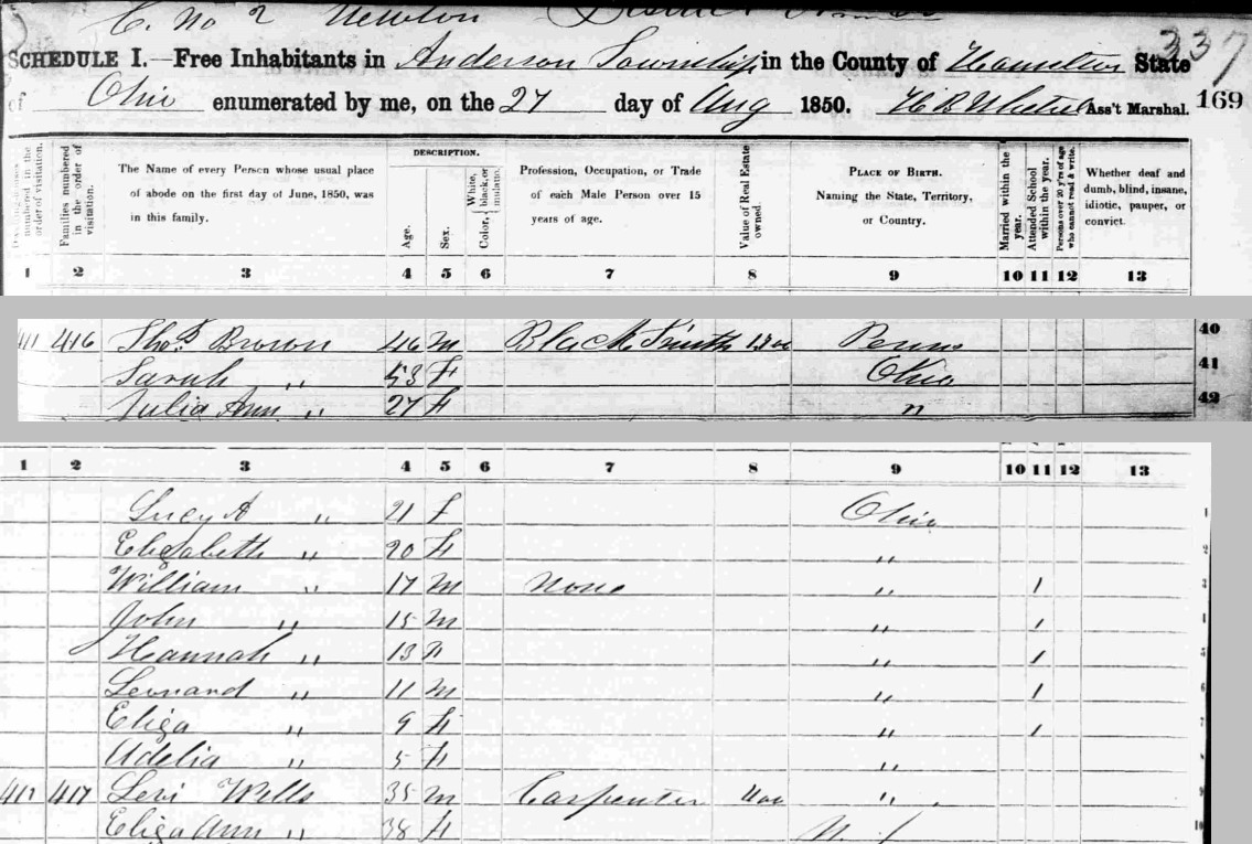 Thomas Brown, son of Hubbard Brown, is listed in the 1840, 1850 and 1860 censuses for Anderson Township in Hamilton Co., Ohio. Unfortunately, we've found no record of him in the 1820 or 1830 census. In the 1840 census he is listed as age 40-50 with a female, age 30-40, presumably wife Sarah, and nine children living with him. In the 1850 census it is clear that his and wife Sarah's ages were reversed. There is some confusion around Thomas Brown's 1850 census record. Both Ancestry and FamilySearch census records for Anderson Township are out of order. In FamilySearch records, Thomas, Sarah and Julia Ann appear at the bottom of Image 1. The rest of the family appears at the top of Image 4. However, it's apparent from the "order of visitation" in Field 2 that Image 4 should have immediately followed Image 1. We should also note that the enumerator wrote Thomas Brown's first name in a particular style of that time: Tho:s. We believe this is why some researchers have given him the middle initial "S" which does not appear on any record we're aware of.