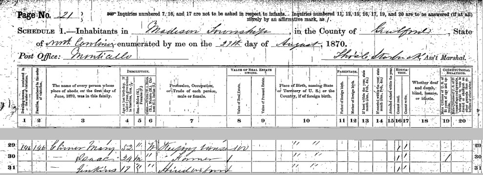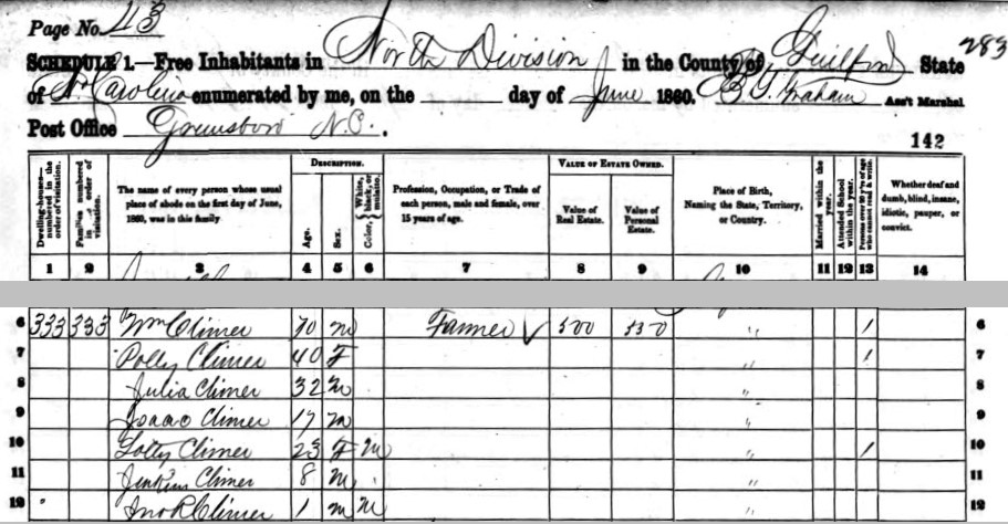 The 1860 and 1870 census records have some interesting details and inconsistencies. There's a twelve year difference in Mary's age which is not too unusual, but there's a seven year difference in Isaac's age which is more significant. Since Isaac was born on June 15, 1845 and each census was supposed to reflect conditions on June 1, his age in 1860 should have been 14 and in 1870 was appropriately listed as 24. In 1860 Julia Climer is listed as a male. There were a number of male Julia's in the North Carolina census, so this may be accurate. His relationship to William and Mary Climer is not known at this time. Lotty and John (Jno) Climer are listed as mulatto. Again, their relationships to William and Mary Climer are not known.