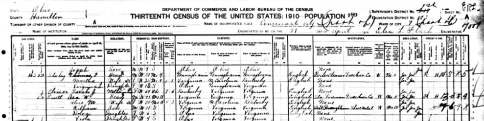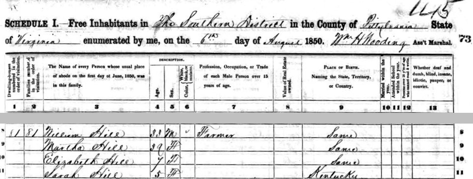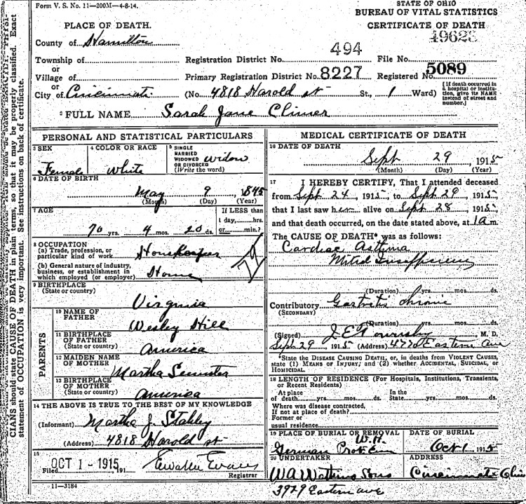 Sarah Jane Hill was born on May 9, 1845. Her parents were William Hill and Martha (Seamster) Hill. William Hill, a farmer, married Martha Seamster on Jan. 17, 1842 in Pittsylvania Co., Va. Sarah Jane (Hill) Climer's 1915 death certificate indicates her father was Wesley Hill, but their marriage record and the 1850 census record for her family indicate that her father's name was William. There is some question about Sarah Jane's year of birth and place of birth. In the 1880 census (see below) her age is listed as 32, which would make her year of birth 1848. The Pittsylvania Co., Va. record of her marriage in 1873 indicates her age was 22, which would make her year of birth 1851. Finally, her death certificate, which was signed by her daughter Martha Stahley and is consistent with the 1850 census record, gives a birth date of May 9, 1845. The 1850 census indicates she was born in Kentucky while the rest of her family was born in Virginia. The 1910 census also indicates she was born in Kentucky. The 1880 and 1900 censuses and her death certificate say she was born in Virginia. We tend to believe the 1850 census since it was compiled only five years after her birth and is confirmed by the 1910 census. Therefore, it would appear that the Hill family moved to Kentucky for a few years in the 1840s before moving back to Pittsylvania Co., Va.