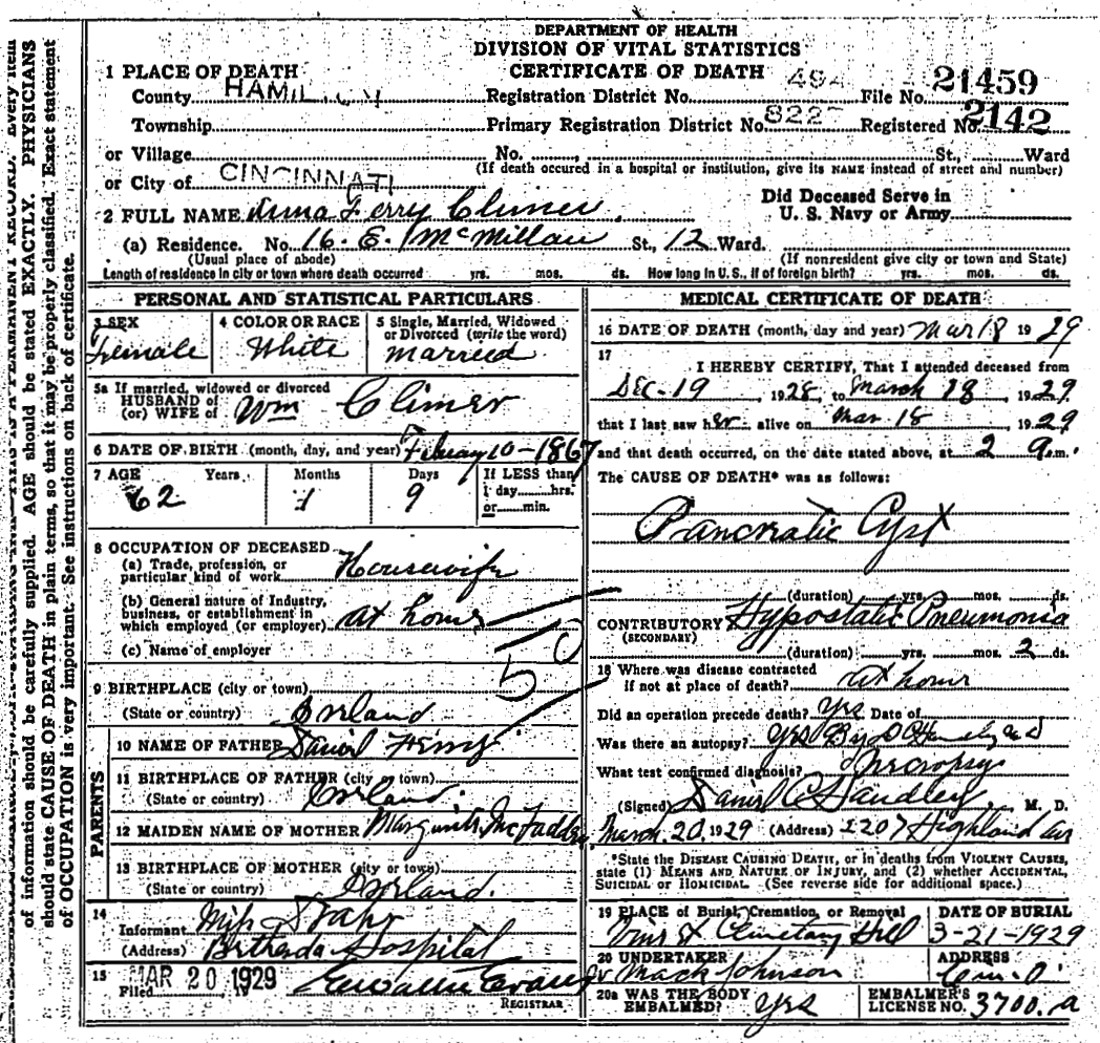 William E. Climer, Sr. had a restaurant on West Sixth Street at the Sixth Street Market. Their home was at 18 East McMillan Street. His wife Bridget Anna (Ferry) Climer died on March 18, 1929 in Hamilton Co., Ohio (see death certificate). His daughter Jane Ferry Climer and her husband William H. Cobb went to the University of Cincinnati. William Edgar (Sonny) Climer, Jr. and his wife Ruth lived at 16 East McMillan Street in Cincinnati until it was turned into a bank parking lot. Sonny and Ruth graduated from the University of Cincinnati, where Sonny played football, and both were elementary physical education teachers. They did not have any children. Family members remember Sonny as a "wonderful guy, full of jokes and riddles and family stories." After Sonny's death in 1993, Ruth Climer established a scholarship in his name at the University of Cincinnati.