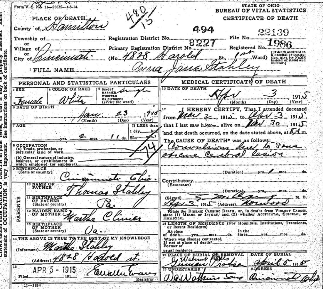- Anna Jane Stahley, b. Jan. 23, 1915, d. April 3, 1915 (see death certificate).