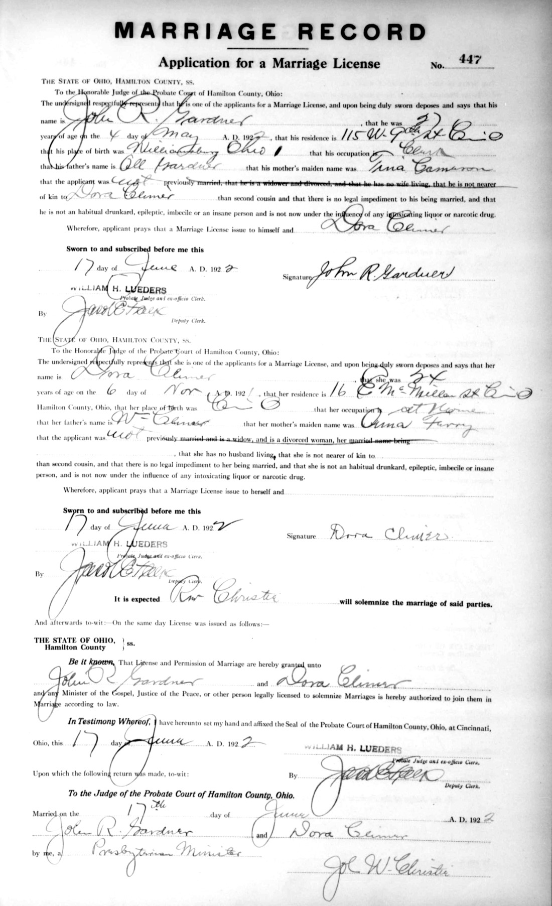 - Dora (Eunidore), b. Nov. 6, 1897, m. John R. Gardner on June 17, 1922 in Hamilton Co., Ohio (see marriage record).