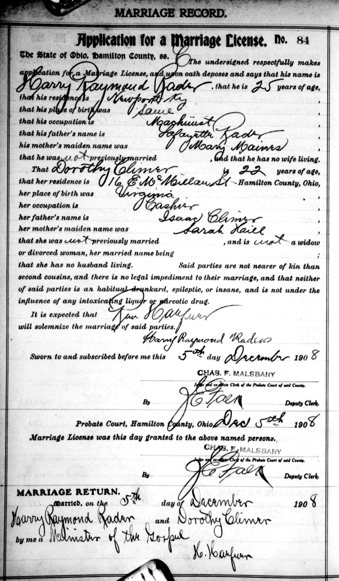 - Dorothy Climer, b. Aug. 31, 1886 in Pittsylvania Co., Va., m. Harry Raymond Rader on Dec. 5, 1908 in Hamilton Co., Ohio (see marriage record).