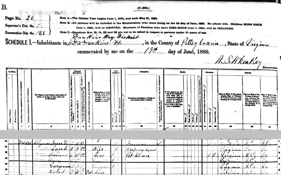 | Sarah Clymer | F | 32 | Wife | X | Keeping house | Virginia | |||