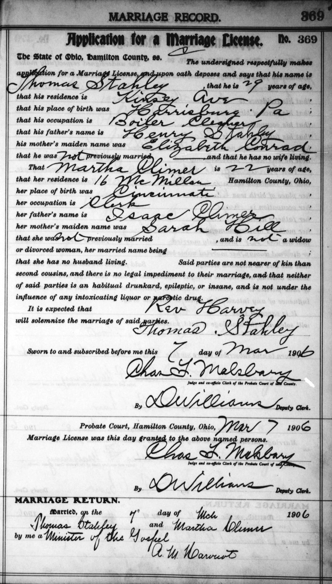 - Martha Jane Climer, b. April 1, 1884 in Pittsylvania Co., Va., m1. Thomas F. Stahley on March 7, 1906 in Hamilton Co., Ohio (see marriage record), m2. Joseph Ennis around 1940, d. Oct. 15, 1964.