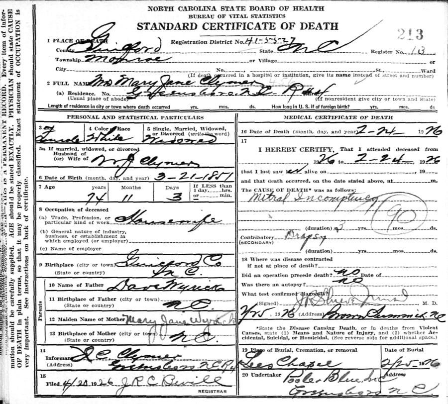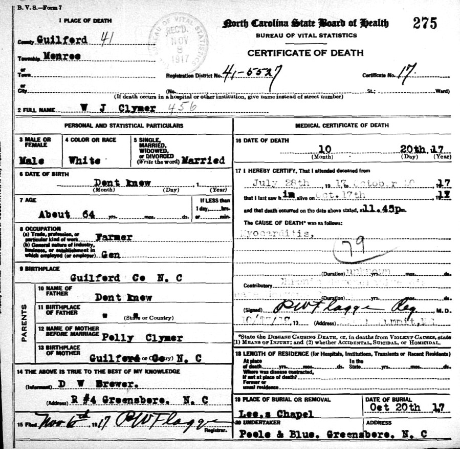 William Jenkins Climer, son of Mary (Polly) Climer, remained in Guilford Co., North Carolina. He married Mary Jane Wyrick on March 18, 1886 in Guilford Co., N.C. They had five children including William David Climer who was born on Oct. 16, 1887. Mary (Polly) Climer, who was born on April 5, 1817 in Guilford Co., died on May 11, 1896. According to William David Climer's descendants, the family changed the spelling of their name to "Clymer" around the 1930s and everyone else in this line did so as well. The 1910 and 1920 census records verify that the family was still spelling their name "Climer" in those years. However, it's interesting that the death certificates for both William J. Climer (death certificate) who died on Oct. 20, 1917 and Mary Jane (Wyrick) Climer (death certificate) had the last name spelled "Clymer." Mary Jane (Wyrick) Climer, who was born on March 21, 1851, died on Feb. 24, 1926.