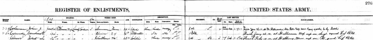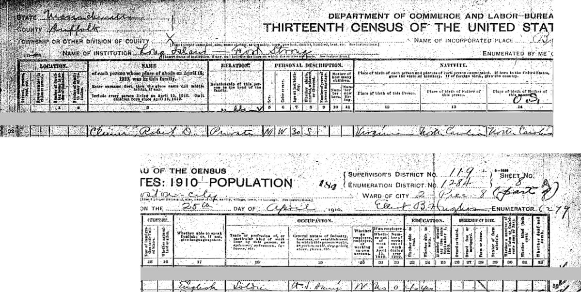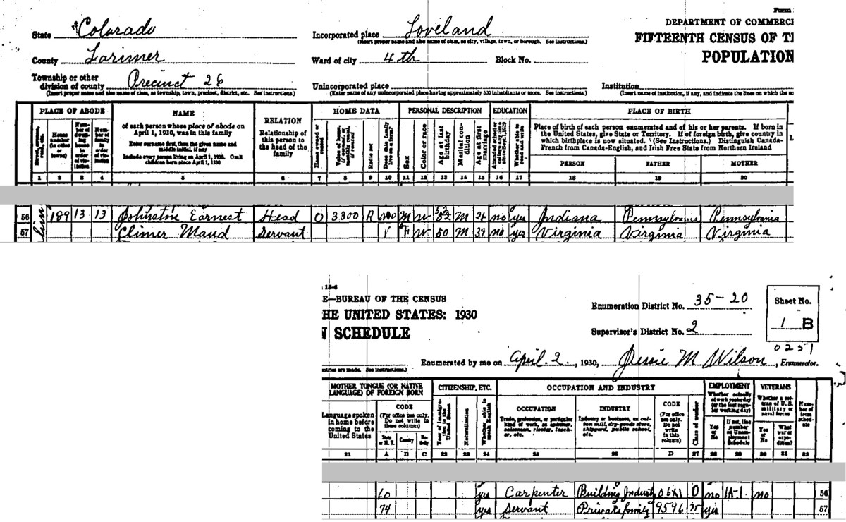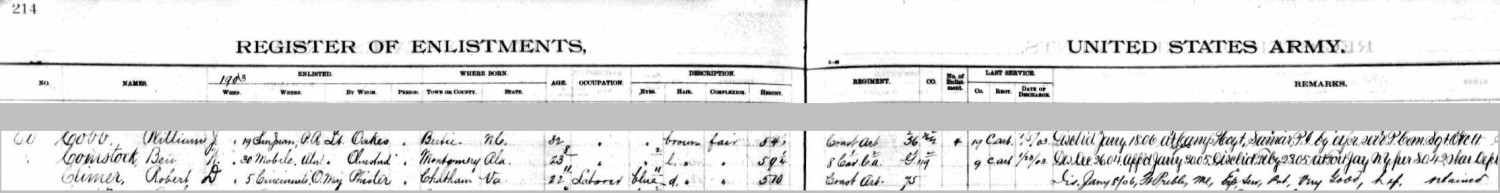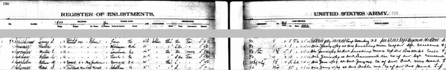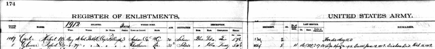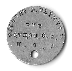 Before he enlisted in the Army, Robert Denny Climer was a stone cutter and a laborer according to two source documents. He enlisted in the Army on Jan. 5, 1903 and joined the Coast Artillery Corps where he remained, in various Companies, throughout his military career. He was discharged from his first enlistment on Jan. 8, 1906 at Ft. Preble in Maine. He reenlisted on Jan. 16, 1906 at Ft. Banks in Massachusetts and was discharged again at Ft. Preble on Jan. 15, 1909. There followed two more enlistments and discharges: reenlisted at Ft. Slocum, N.Y. on Jan. 25, 1909, discharged at Ft. Strong, Mass. on Feb. 17, 1912; reenlisted at Columbus Barracks (later Ft. Hayes) in Columbus, Ohio on May 17, 1912; discharged on Feb. 17, 1917. Robert's marriage to Annie Ratigan must have been short because there is a record of a child being born to Robert D. Climer and Almer Peterson in 1908 in Maine. The child died after just a few days. According to the 1910 census, Robert was stationed at Fort Strong in Boston, Mass. His marital status indicated that he was single at that time. His dog tags indicate that he was in the 46th Company of the Coast Artillery Corps. On Feb. 17, 1920 Robert D. Climer married Anna [Maude] Motley in Monroe, Mich. Maude, born in 1879 in Chatham, Va., was the daughter of James Motley and Elizabeth Scates. Their marriage record indicates that Robert Climer was a ranchman residing in Weston, Kansas (probably Weston, Missouri). Since Weston, Missouri is very close to Ft. Leavenworth, Kansas, it is likely that Robert Climer spent some time there after his assignments in Maine and Mass. It's interesting that both Maude and Robert were born in Pittsylvania Co., Va. Robert's family was living in Hamilton Co., Ohio by the late 1890s. It may be that Robert met Maude on a trip to Chatham, Va. to visit his sister Georgeanna, but that doesn't explain why they were married in Michigan. It is said that Robert and Maude moved to Loveland, Colo. around 1924 because of his tuberculosis. Robert D. Climer died on Aug. 2, 1929 in Loveland, Colo. The 1930 census indicates that Maud[e] Climer was a servant in the household of Earnest Johnstone of Loveland, Larimer Co., Colo. Maude Climer died in 1947.
