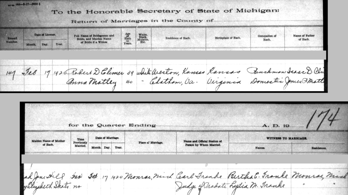 - Robert Denny Climer, b. Feb. 21, 1880 in Pittsylvania Co., Va., m1. Annie Ratigan on Nov. 7, 1899 in Hamilton Co., Ohio (see marriage record), m2. Anna [Maude] Motley On Feb. 17, 1920 in Monroe, Mich. (see marriage record), d. Aug. 2, 1929 in Loveland, Colo.