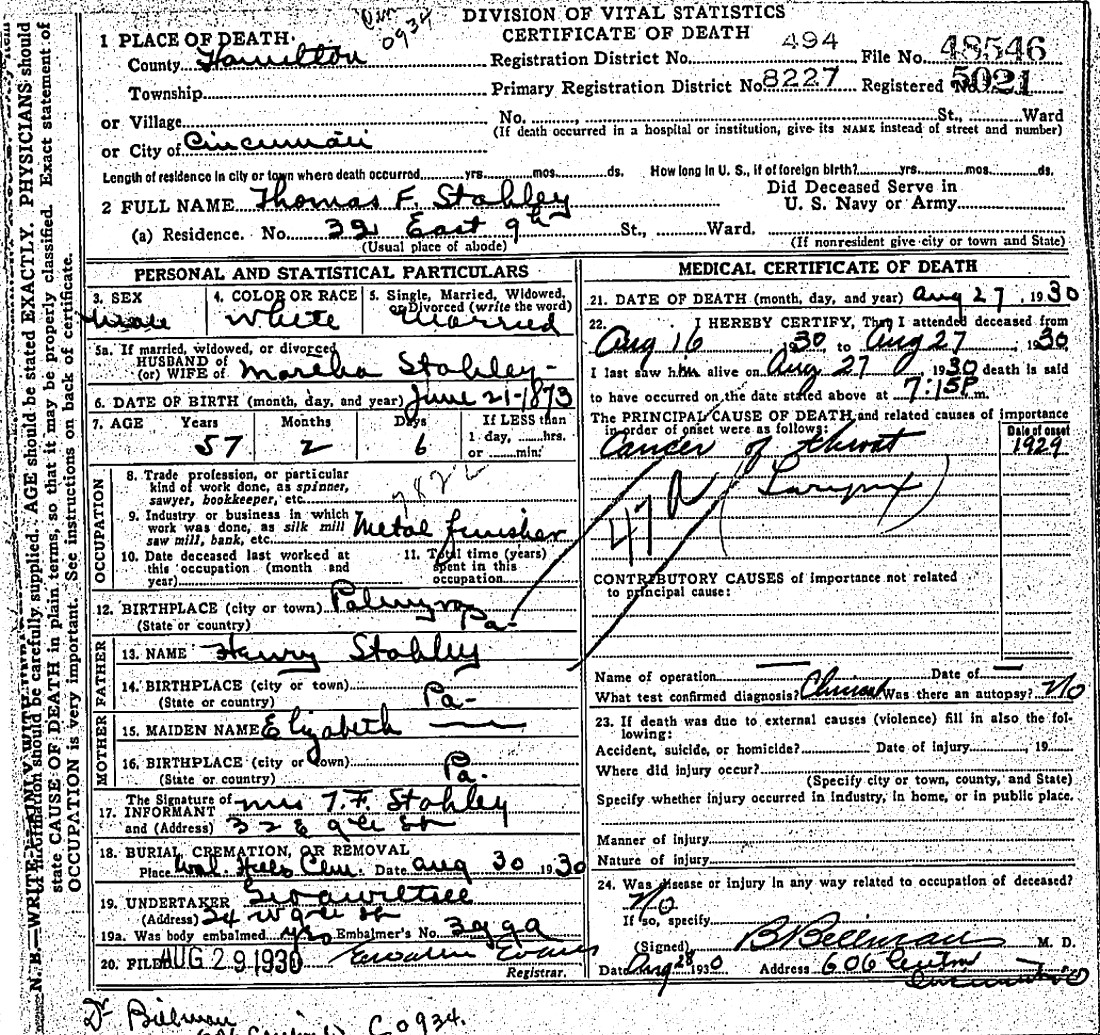 Martha Jane Climer first married Thomas F. Stahley who was born on June 21, 1873 in Palmyra or Harrisburg, Penn. He died on Aug. 27, 1930 of throat cancer (see death certificate). Thomas and Martha Stahley had the following children: