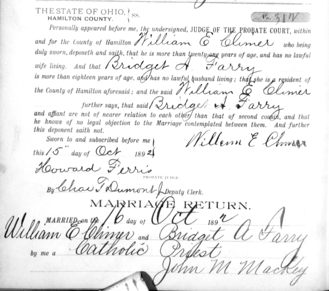 - William Edgar Climer, b. July 20, 1867 in Pittsylvania Co., Va. m. Bridget Anna Ferry on Oct. 15, 1892 in Hamilton Co., Ohio (see marriage record), d. July 29, 1934 in Middletown, Butler Co., Ohio (see death certificate).