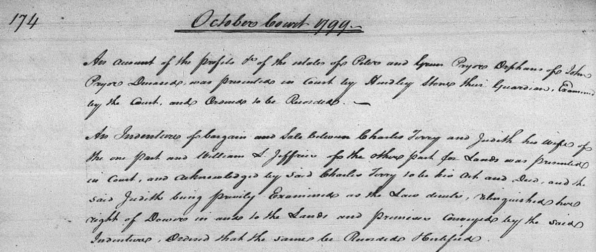 We have found a few documents that help fill in some of the details of William Jeffreys' life after the Revolutionary War. Two Pittsylvania County Indentures, one a sale of 214 acres from "William Jeffries [of Pittsylvania County] and Salley his Wife" to Obadiah Echols of Pittsylvania County dated October 21, 1799, the other a sale of 185 acres from William and Sally Jeffries of Halifax County to David C. Williams of Pittsylvania County dated October 15, 1810. Besides providing us with the first name of the wife of William Jeffreys, the 1799 indenture may also signal the approximate year William Jeffreys moved from Pittsylvania County to Halifax County (1799 instead of 1792). The 1820 census indicates that William Jeffreys was still living in Halifax County at that time. His household had one male, age 45+, one female under age 10, and one female age 45+. We presume that he and Sally were the two 45+ adults. William Jeffreys would have been age 62, his wife would have been at least age 45 and likely older than that. We suspect the child was a granddaughter.
