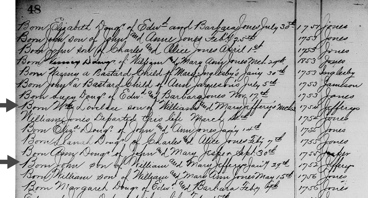 While William Jeffreys said he was born in Richmond Co., Va. "he supposes in the year 1758," records in North Farnham Parish in Richmond County indicate that William Lovelace Jefferys, son of William and Mary Jefferys, was born on March 13, 1754. [His brother John was born two years earlier.] We are confident this is William Jeffreys' actual birth record and that he was just off by four years in his 1832 pension application. Some primary source documents from Halifax and Pittsylvania counties indicate his name was William L. Jeffreys which we believe further supports our belief that this birth record was his. For an example, see this 1799 Pittsylvania County Court Record. If the L looks like an S, compare it to several other words that begin with L including the word Lands three lines down. His father, William Jeffries, was born on July 23, 1716 in Richmond Co., Va. and his mother, Mary Lovelace, was born on February 27, 1728 in that same county.