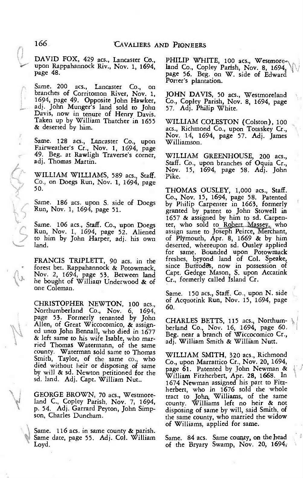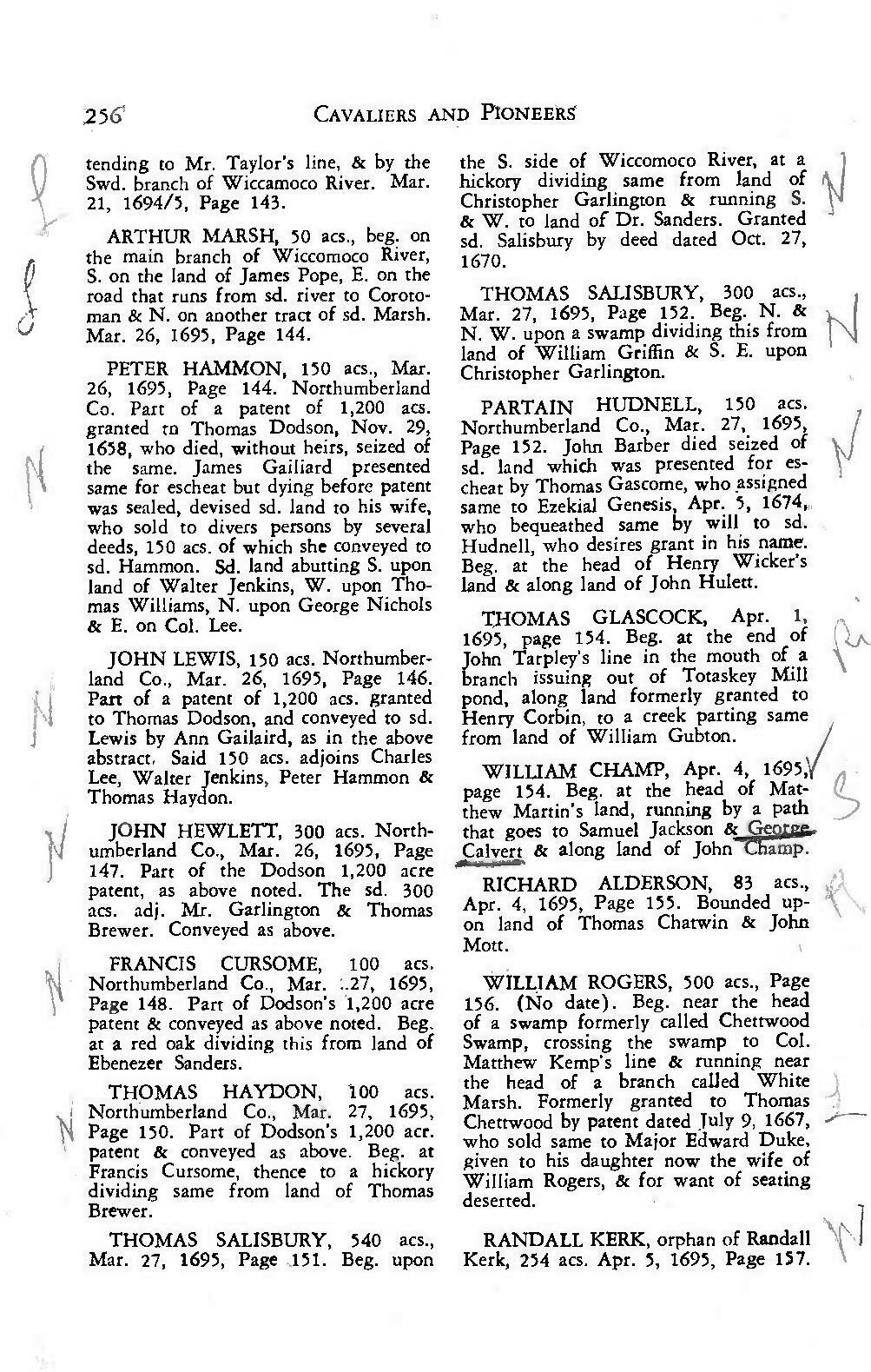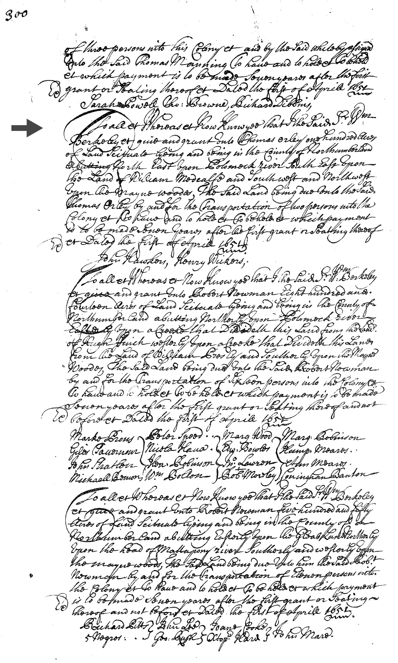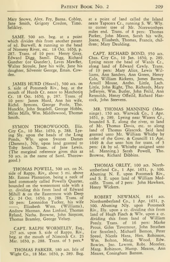 Are Thomas Orley's 1651 headright patent and Thomas Diniard's 1659 last will enough evidence to prove the time and place of John Hocker's immigration to America and subsequent migration to Maryland? We believe the Diniard will is consistent with what we know about the subsequent movements of John Hocker and his family. However, it's possible the person named in the Orley patent is not the same John Hocker/Hawker. The date of the patent is consistent with someone migrating across the Potomac River from Virginia to southern Maryland and subsequently appearing in a legal document in St. Mary's Co., Maryland, even if John Hawker had to serve a few years as an indentured servant. However, we have found two land patents from the 1690s which may suggest both John Hawker and Henry Wickers remained in the Northern Neck area of Virginia after their immigration. Since these patents were filed more than 40 years after their assumed immigration date, it's possible one or both were either children of the principals or were not related to the individuals on the Orley patent. We have not found a similar immigration document for a John Hocker/Hawker in Maryland, at least one that would be consistent with the last will of Thomas Dinaird. Therefore, we're inclined to believe that the Orley patent is for our John Hocker.