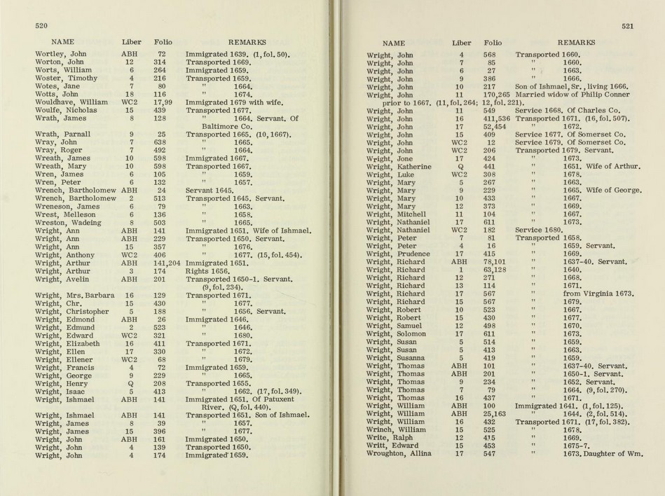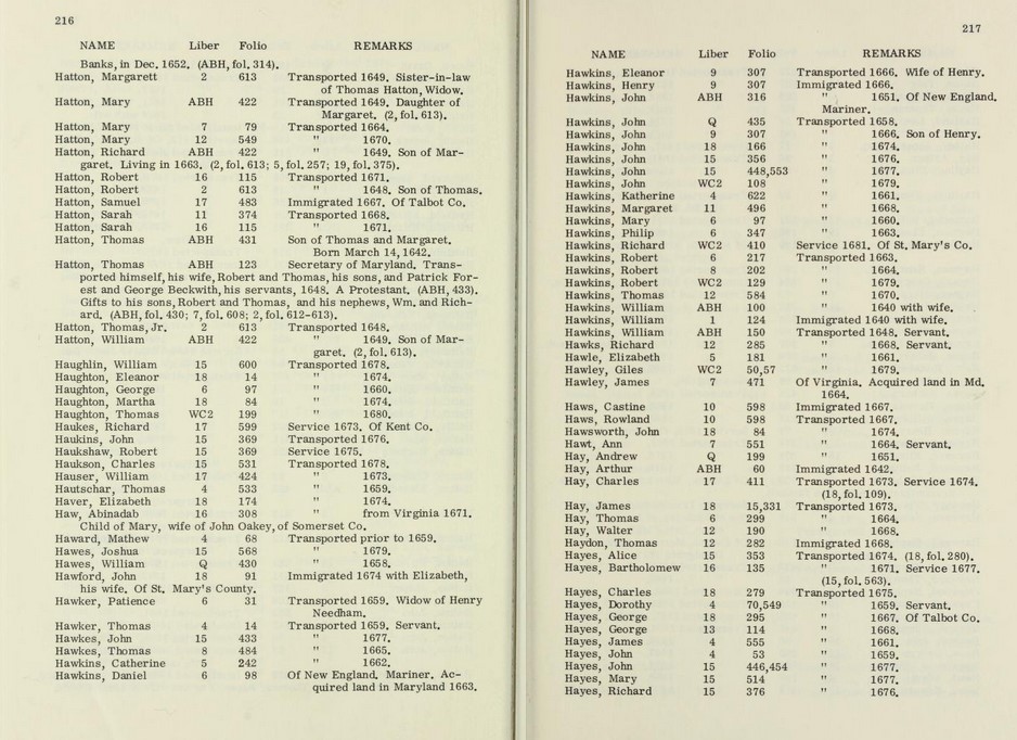 It is not known what happened to John Hocker's first wife, but in 1671 John Hocker is said to have married Elizabeth Wright in Annapolis, Anne Arundel Co., Md. According to these reports, Elizabeth was the daughter of John Wright and Barbara Wright. We know that John, Barbara and Elizabeth Wright immigrated to Maryland in 1671 along with Thomas, William and Richard Wright based on a compilation of records titled "The Early Settlers of Maryland: an Index to Names of Immigrants, Compiled from Records of Land Patents, 1633-1680, in the Hall of Records, Annapolis, Maryland." The story told by Hocker/Hawker descendants is that the Wrights were Scottish immigrants and that John Hocker paid for their transportation with the agreement that he could marry their daughter.
