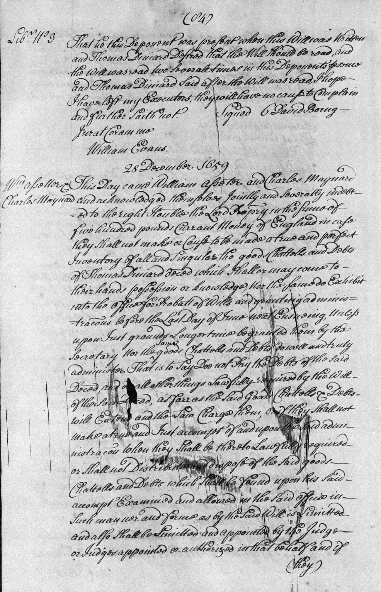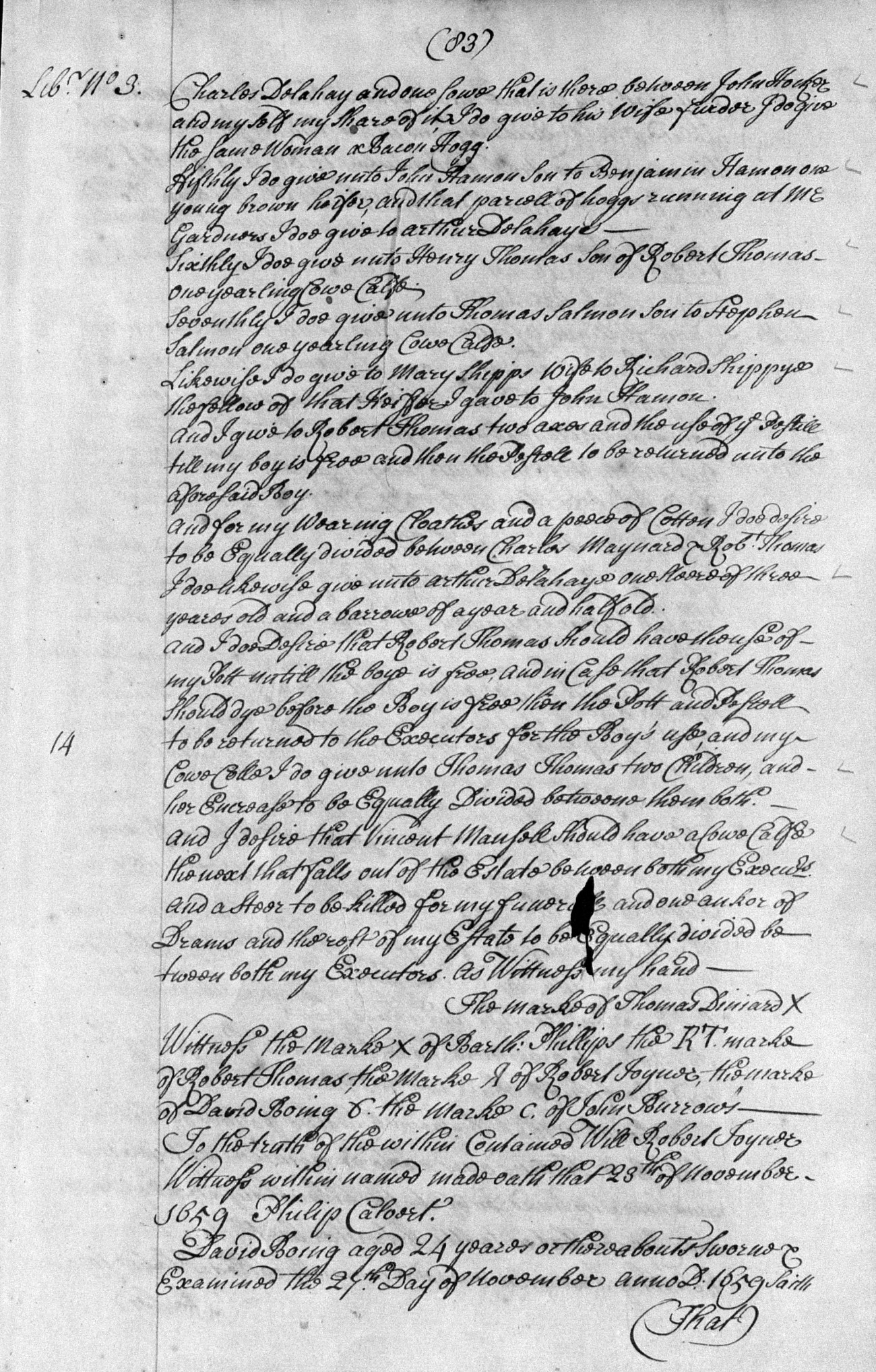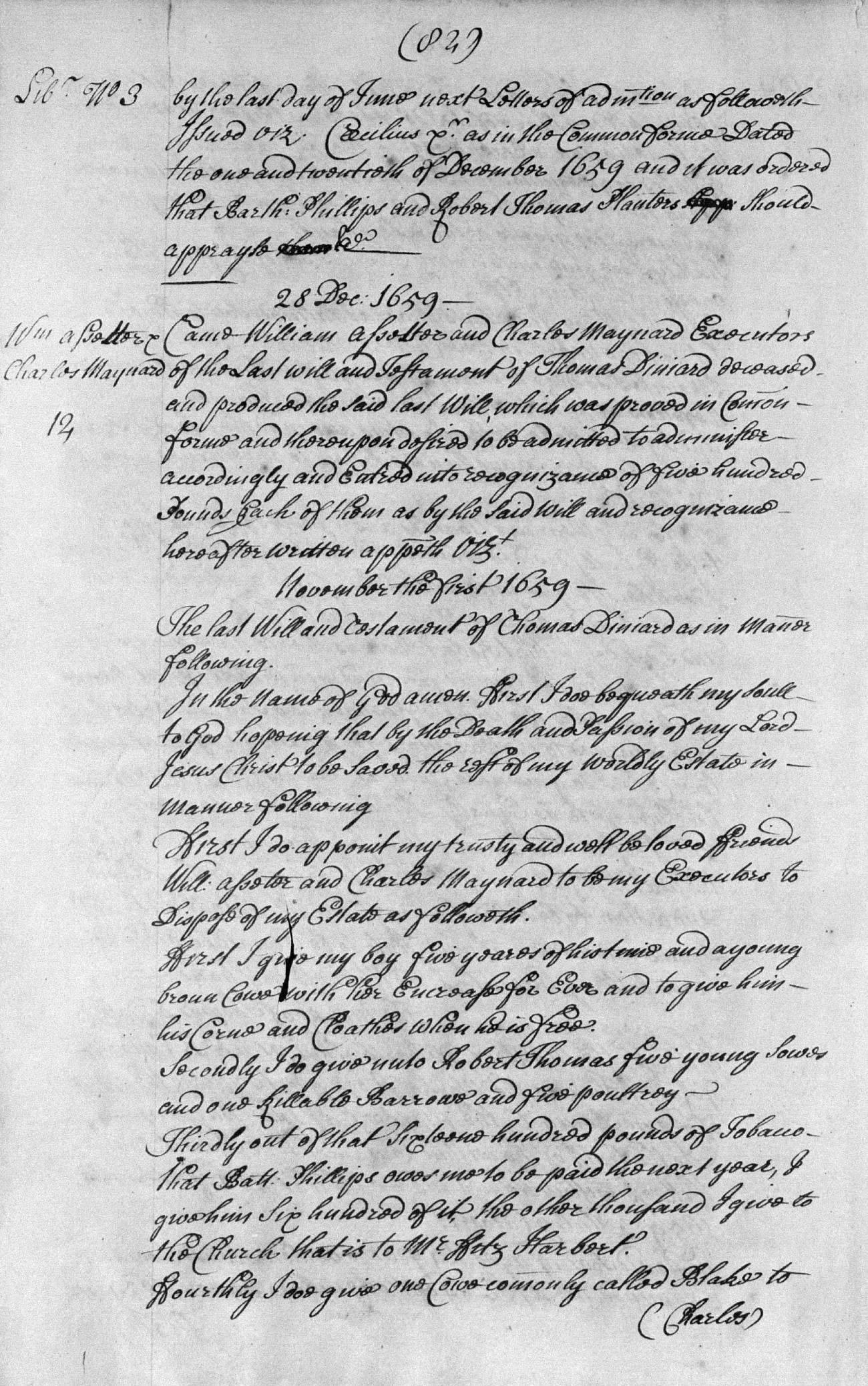 John Hocker, whose family was likely of German ancestry, is said to have been born around 1635 in Wales based on Hawker family accounts handed down through the generations. Many Germans migrated to Wales in the 16th century to work in the mines and the Hockers could have been part of that migration. Some family accounts say that John Hocker was kidnapped in Wales and sold to a ship's captain who was about to leave for Virginia. There is little research, however, to corroborate this Wales connection. The first confirmed record for a John Hocker/Hawker is a 1651 patent by Thomas Orley to obtain 100 acres in Northumberland Co., Va. for transporting two individuals, John Hawker and Henry Wickers, to colonial Virginia. Northumberland Co., Va. is just across the Potomac River from St. Mary's Co., Md. where, a few years later, we find John Hocker mentioned along with his wife in Thomas Diniard's 1659 last will. The key passage from the top of page 2 of the will says "... and one sowe that is there between John Hocker and myself [i.e., we share ownership] my share of it I do give to his wife furder [in Old English, this meant "further"] I do give the same woman a Bacon Hogg." Some have said that this passage indicates that John Hocker's wife's name was Furfer (see the abstract in the Maryland Calendar of Wills, Vol. 1, by Jane Baldwin, for example), but it's clear in the original script that the word furder was not capitalized and the fourth letter was a "d" and not an "f." Based on the will, we know that John Hocker was married before 1659. Some sources indicate that he married Mary Greene who was born around 1637 and was a presumed daughter of Maryland's Governor Thomas Greene. Unfortunately, we can find no evidence to support the name of his first wife.