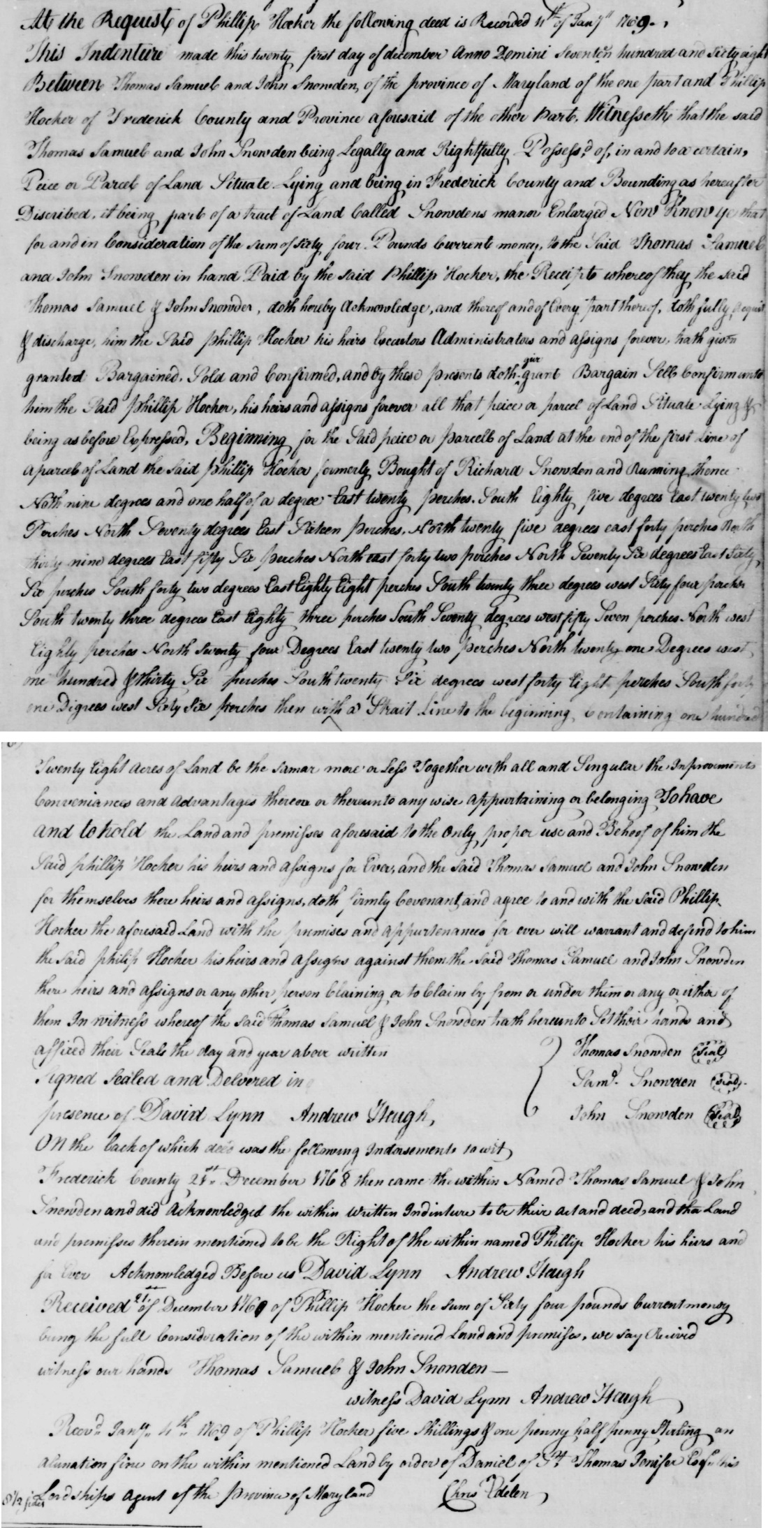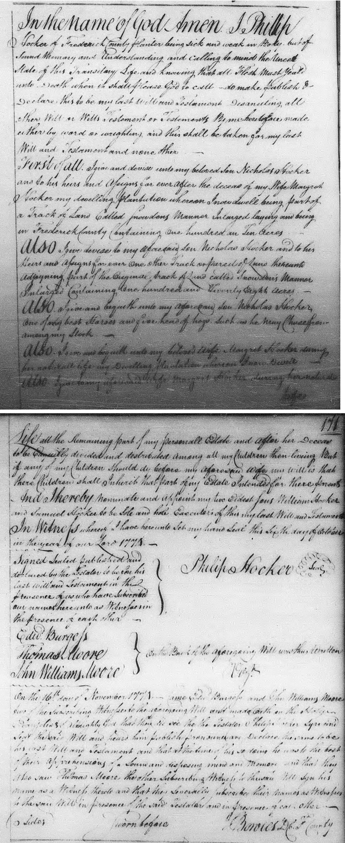 The Pruitts did not leave much of a footprint in Maryland records in the early to mid-1700s. Only one Pruitt marriage record has been found so far, Priscilla Pruitt's marriage to William Duvall (see this 1940 transcription of the Rock Creek parish church record). Some lists of children for Samuel and Elizabeth Pruitt include Patience and Mary. We do not include them here because we are confident they were born to other Pruitts in Maryland. The only other records uncovered so far are the 1733 List of Taxables in which, among others, Samuel Pruitt, Nicholas Hawker and Philip Hawker appear. Other records are Samuel Pruitt's 1737 lease agreement, his 1760 last will and inventory documents which appear on Pruiett, Part 2. With this in mind, there is a question that's been raised by some researchers as to whether Margaret Pruitt existed and whether she or a Margaret Snowden married Philip Hocker. Since no marriage record has been found, we have to rely on Philip Hocker's last will, a deed recorded in Frederick Co., Md. and Richard Snowden's last will to make a subjective determination. The primary (and perhaps only) argument in favor of Philip Hocker marrying a Margaret Snowden is the fact that he left his son, Nicholas Hocker/Hawker, more than one hundred acres of a tract of land called Snowden's Manner [Manor] Enlarged. We believe researchers originally deduced that his wife must have been a Snowden for him to possess this tract. Now we know that he purchased the land, "part of a tract of land called Snowdens manor Enlarged," from Thomas, Samuel and John Snowden in 1769. From Richard Snowden's 1763 last will, we know that his three sons, Thomas, Samuel and John, inherited Snowden's Manor Enlarged, along with many other properties, from their father and chose to sell a part of that property to Phillip Hocker who also had bought another parcel from Richard Snowden earlier. From that will, we also learn that Richard Snowden's daughter Margaret had married a John Contee (see Page 3 of last will) around 1744, the same timeframe in which a Margaret had married Phillip Hocker. While this removes the principle argument in favor of Phillip Hocker marrying a Snowden, it does not prove that Margaret Pruitt was his wife. Some researchers have indicated that Philip Hocker's son, Samuel, was named Samuel Pruitt Hocker, but we have not seen a record that substantiates this claim. At this time, we believe the weight of evidence points away from Philip Hocker marrying a Margaret Snowden, and we have tentatively determined that the evidence points towards Margaret Pruitt. As always, this kind of determination is subject to change as more evidence comes to light. Certainly, the geographic proximity of the two families, as the 1733 List of Taxables suggests, makes a Hocker-Pruitt union a plausible presumption, even though Philip would have been her first cousin, once removed. It's of interest to note also that even though Margaret (Pruitt) Hocker was not mentioned in her father's last will (only three of the six children were mentioned), his 1765 estate inventory listed Philip Hawker under "nearest akin" (related by blood).