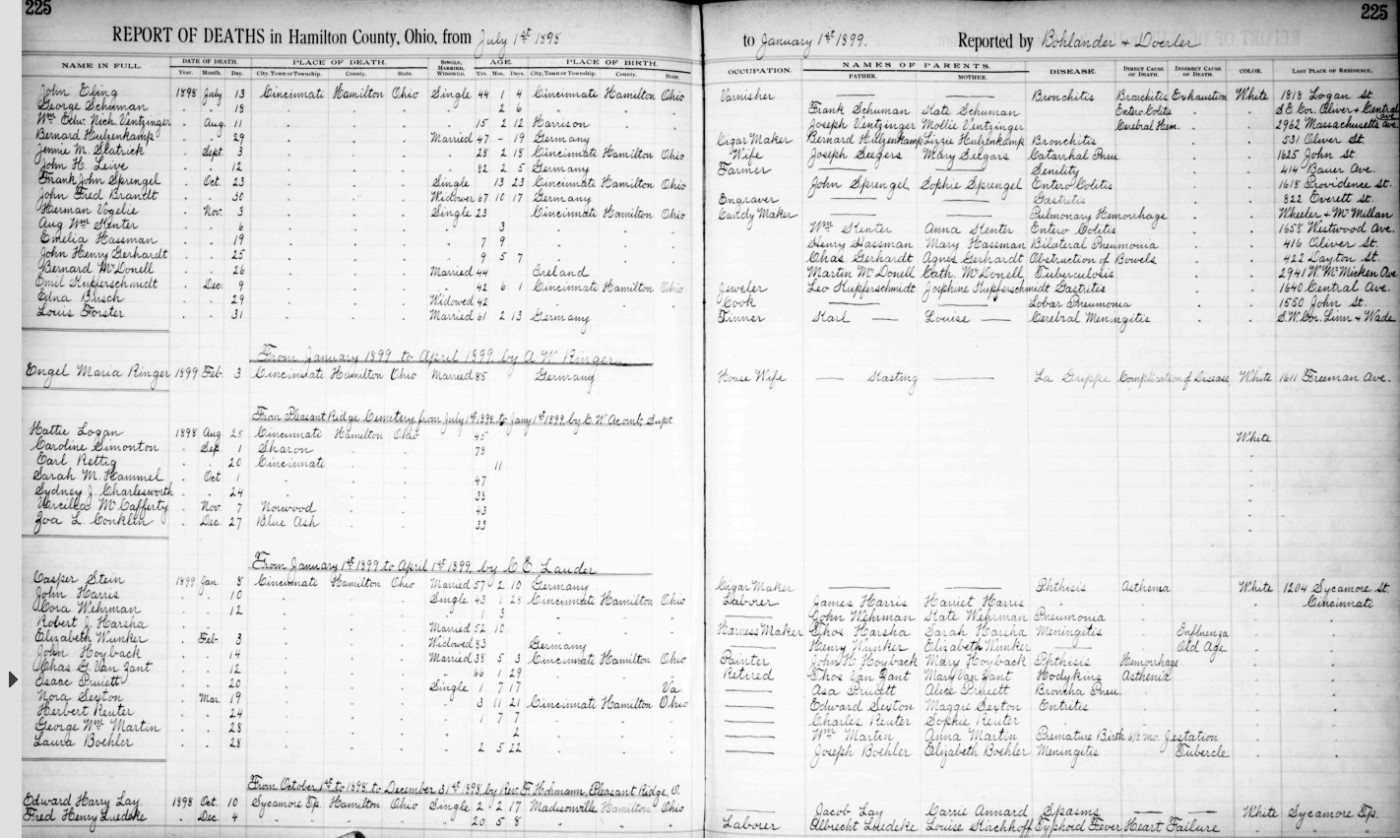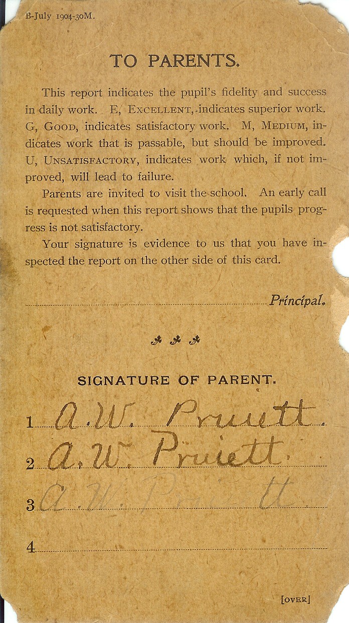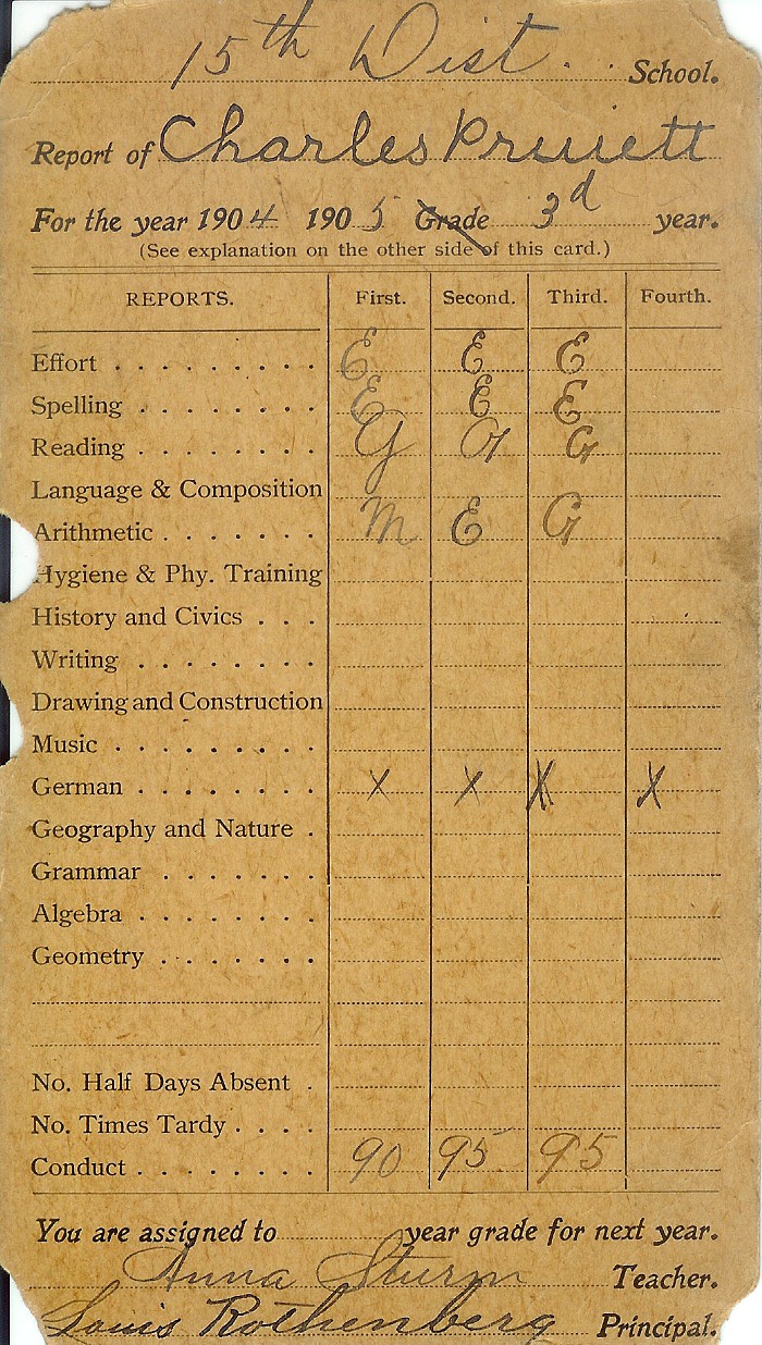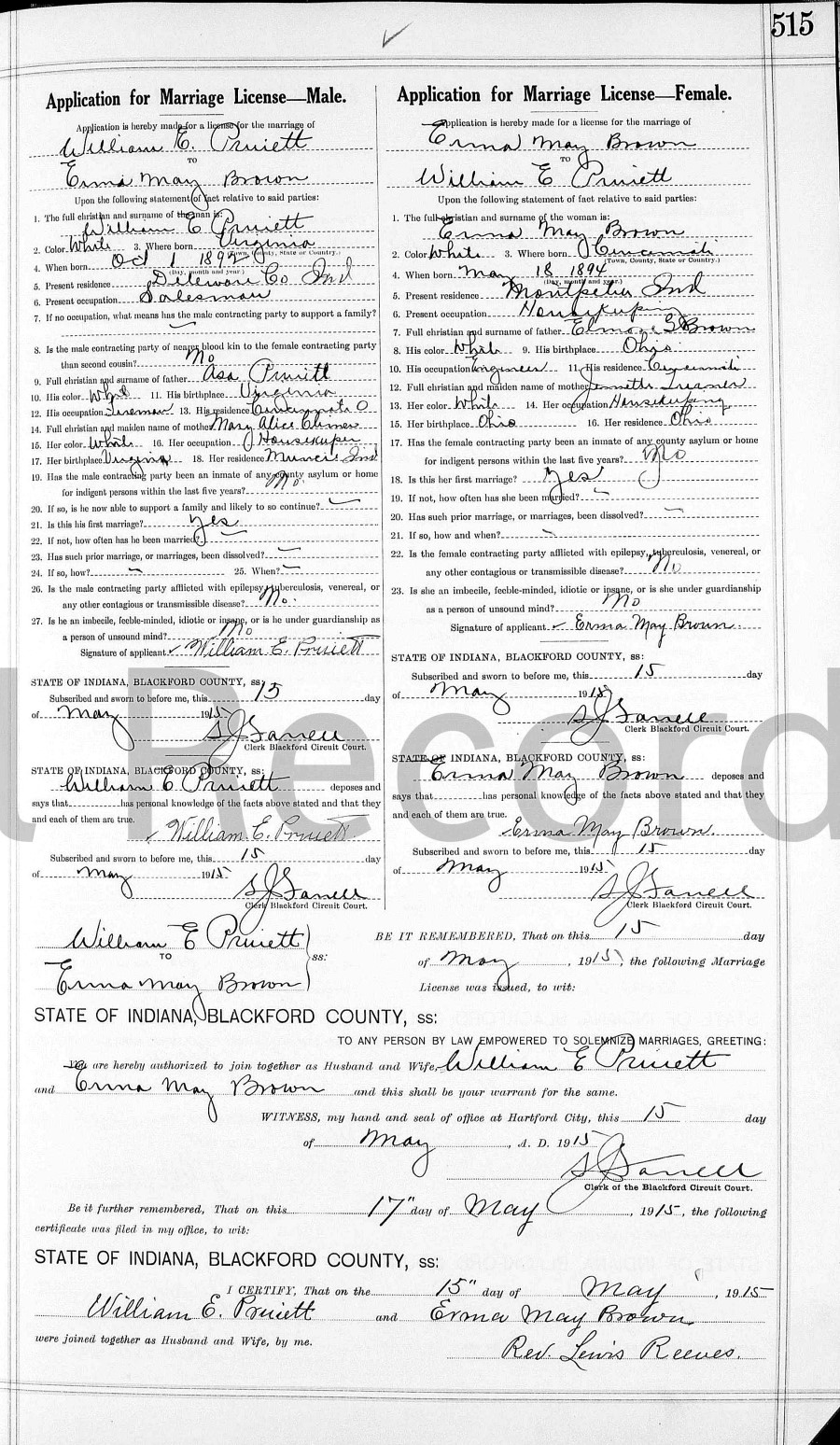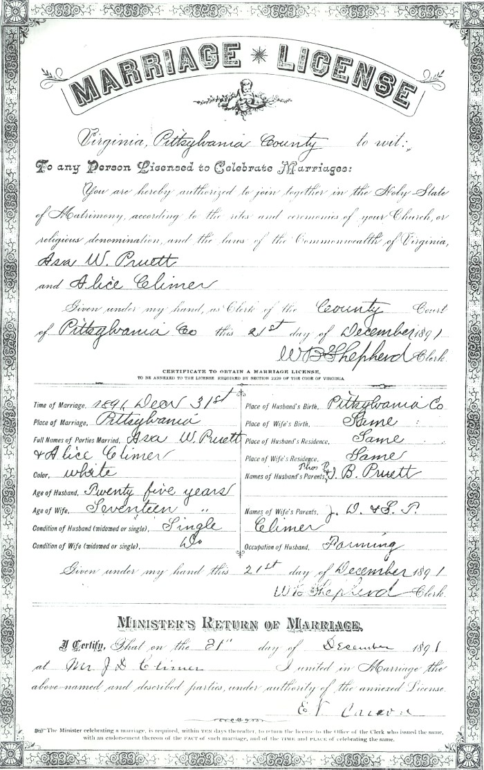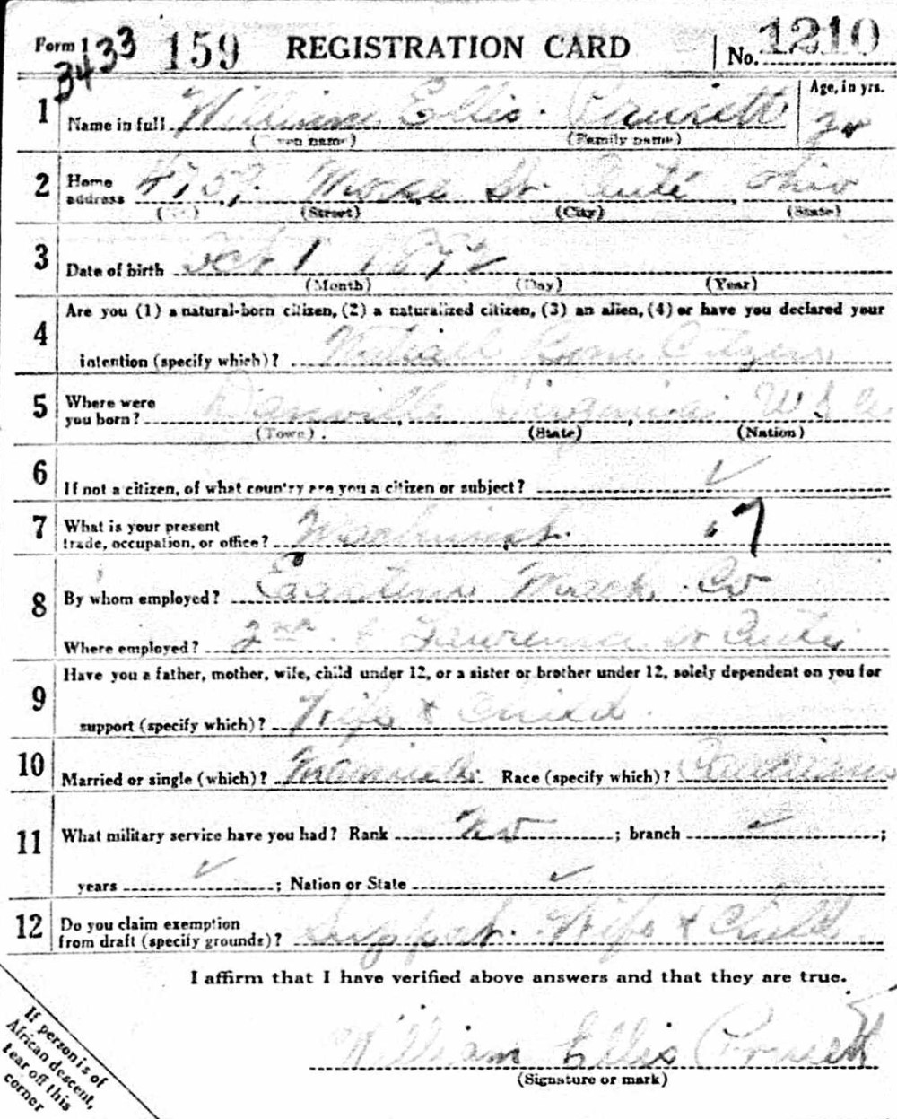 In the narrative that follows, the various spellings of Pruiett reflect differences in the source documents. The family name was spelled "Pruitt" by four generations, from the first Samuel Pruitt around 1700 to Asa Prewitt/Pruitt in the early 1800s. During the 1800s, very few in the family could read or write. This explains the many different spellings of the name during this period including Prewitt, Prewett, Pruit, Pruitt, Pruet and Pruett. Family members signed many of their documents by making an X. Beginning around 1870, the family was spelling the name "Pruett" on a fairly consistent basis as demonstrated on the marriage license of Asa W. Pruett and Alice Climer dated Dec. 31, 1891. After moving to Cincinnati, Ohio in the late 1890s, however, the family, for the most part, made the decision to change the spelling to its current form. Isaac Pruiett's death record in February 1899 is the first document we've found that reflects the spelling as Pruiett. In addition, this document narrows the time frame for the Pruiett move from Virginia to Ohio since it indicates that Isaac died in Cincinnati on Feb. 20, 1899 and was born in Virginia 1 year, 7 months and 17 days before his death. Charles Pruiett's 1905 report card also shows the spelling as Pruiett, as does William E. Pruiett's 1915 Indiana marriage license. Although the 1900 and 1910 census records use other spellings, that could be due to miscommunication with the enumerators. Both Asa's and William's 1920 census records have the current spelling. Also, William Ellis Pruiett's 1917 World War I draft registration card shows the current spelling.