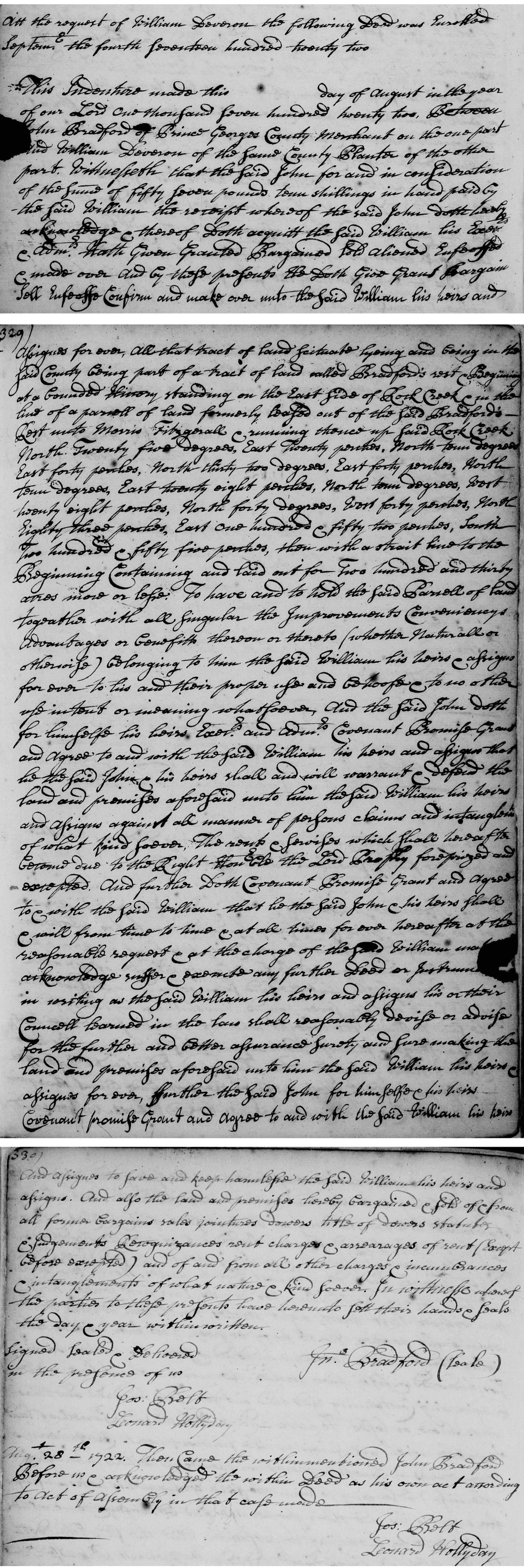 After Rosamond Fitzgerald leased her land in 1717, she or Morris Fitzgerald appeared on the 1719 List of Taxables for Rock Creek Hundred, Prince George's County, along with John Bradford, Nicholas Hocker and James Hook. The name appearing just under John Bradford was Mrs Phesgarall [Fitzgerald]. We can't be sure if Mrs was an abbreviation for Morris or Mistress. However, Rosamond Fitzgarril appeared on a 1719 list of residents who contributed to building a new chapel in Rock Creek. Other names on that list included John Bradford, Nicholas Hocker and James Hook, but not Morris Fitzgerald. We suspect that Morris may have died or moved on before Rosamond leased her land in 1717. The 1719 List of Taxables indicated there were four taxables in the Fitzgerald household. That makes sense since she had to produce a lot of tobacco each year to pay for the lease and other expenses. We suspect one of those taxables was her son Samuel Pruitt, but we do not know who the others were. Perhaps they were other sons of Rosamond and/or Morris Fitzgerald. We have not found Rosamond Fitzgerald in any records after 1719, but we are confident that her son Samuel married Elizabeth Hawker around 1720. We believe that Elizabeth (Wright) Hocker died around 1720, so Elizabeth Hawker may have moved into the Fitzgerald household out of necessity. The only land transaction we've found for Samuel Pruitt was a lease of 100 acres from Nathaniel Beall recorded on November 22, 1737 (discussed in more detail later). Like most leases at this time in Maryland, payment was to be made with the tobacco produced on the land. That meant the first growing season would be 1738 which was exactly 21 years after the March 1717 lease by Rosamond Fitzgerald. This may be evidence that Samuel Pruitt and his family lived on the land that Rosamond leased for a 21 year term in 1717. When that lease was about to end, Samuel chose, or was forced, to look for new land on which to grow tobacco.