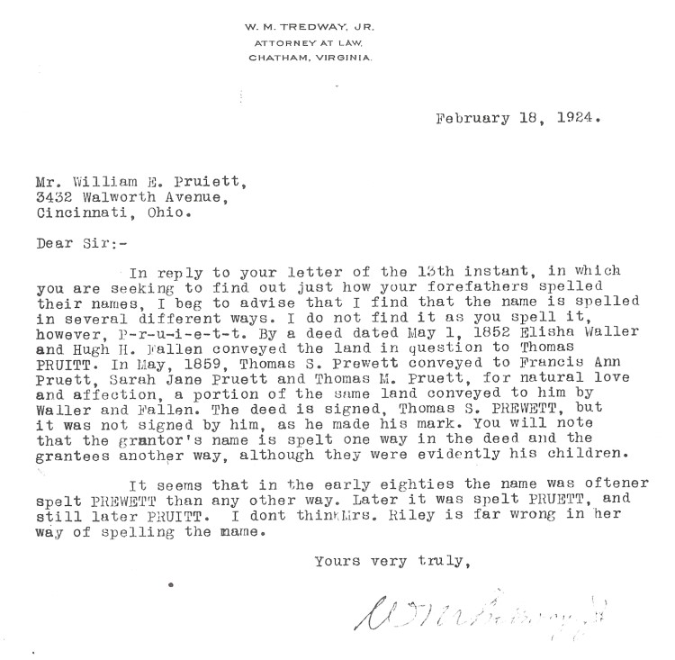 In 1924 William Ellis Pruiett received a letter from W. M. Tredway, a Chatham, Va. attorney, in which he discussed the various spellings of the family name. In his letter to the attorney, William Pruiett had spelled his name "Pruiett" and the attorney responded that he could not find that spelling in any of the family records he found. Despite this, William Ellis Pruiett decided the family would continue to use the name Pruiett. William's father, Acy Pruiett, died in 1924. On his death certificate the name was spelled Pruiett, although in a couple of places the "i" was inserted as a correction.