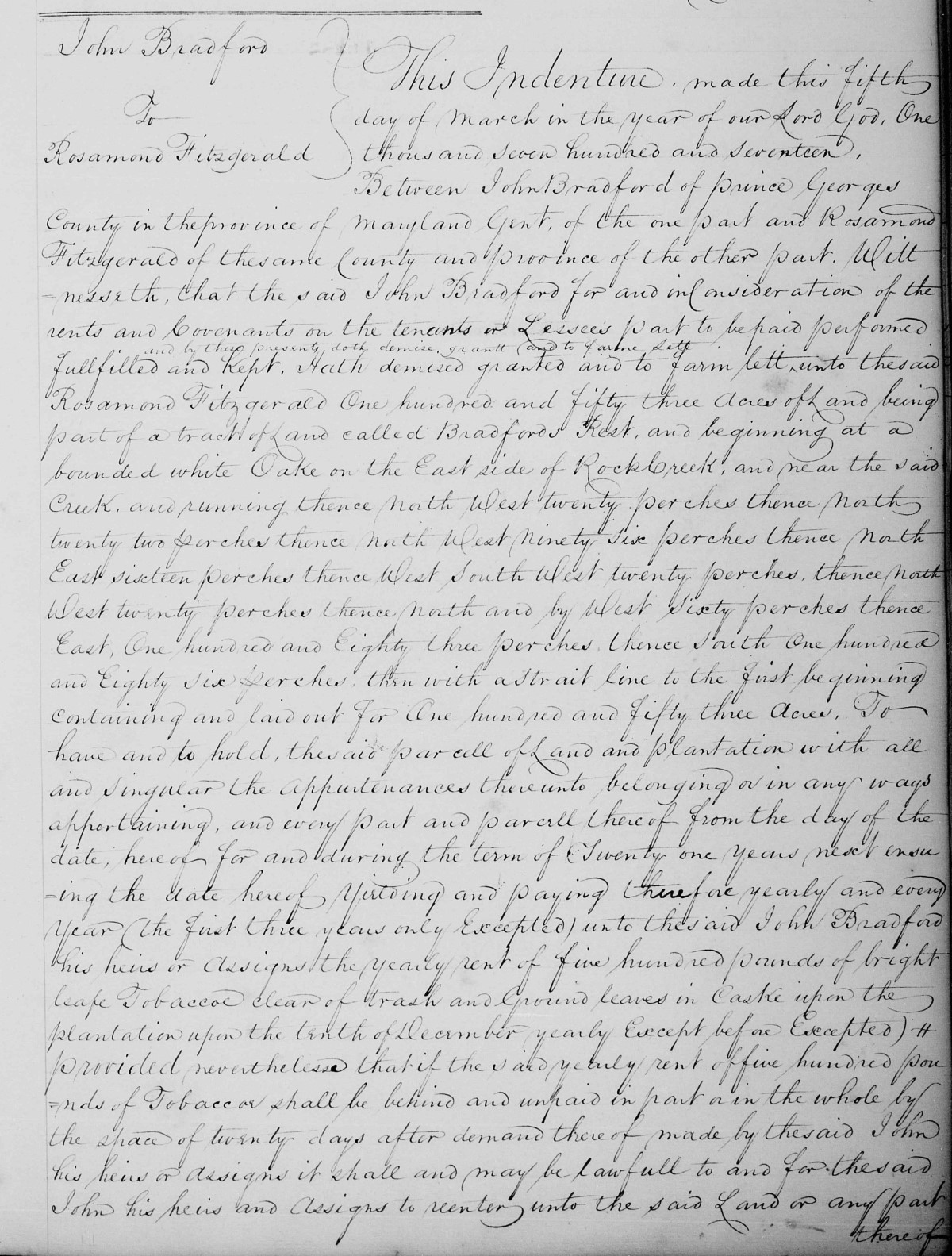 In early 2025, while examining Prince George's County land records in the Maryland State Archives, we came across a 1717 indenture in which a Rosamond Fitzgerald agreed to lease 150 acres of land from John Bradford for a term of 21 years at a cost of 500 pounds of tobacco for each year, with the first three years excepted. The land she leased was owned by the same man who, in 1714, had leased land to James Hook who was married to Margaret Hocker, the aunt of Samuel Pruitt's future wife, Elizabeth Hawker. The land was also located near property that was leased by John Madin [Maddin], Elizabeth (Wright) Hawkes/Hocker (the grandmother of Elizabeth Hawker) and Margaret (Hocker) Hooke. For more on this 1718 lease agreement, see Hawker, Part 1. It has also been determined that a Morris Fitzgerald leased property from John Bradford sometime before 1722 and possibly before Rosamond's lease date of 1717. In an indenture recorded on August 28, 1722, John Bradford indicated the property he was selling to William Deveron had been leased previously by Morris Fitzgerald. We do not know the relationship of Morris Fitzgerald to Rosamond, but records discussed below from Northumberland Co., Va. and Charles Co., Md. suggest a few possibilities.