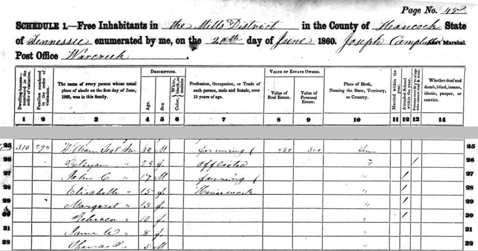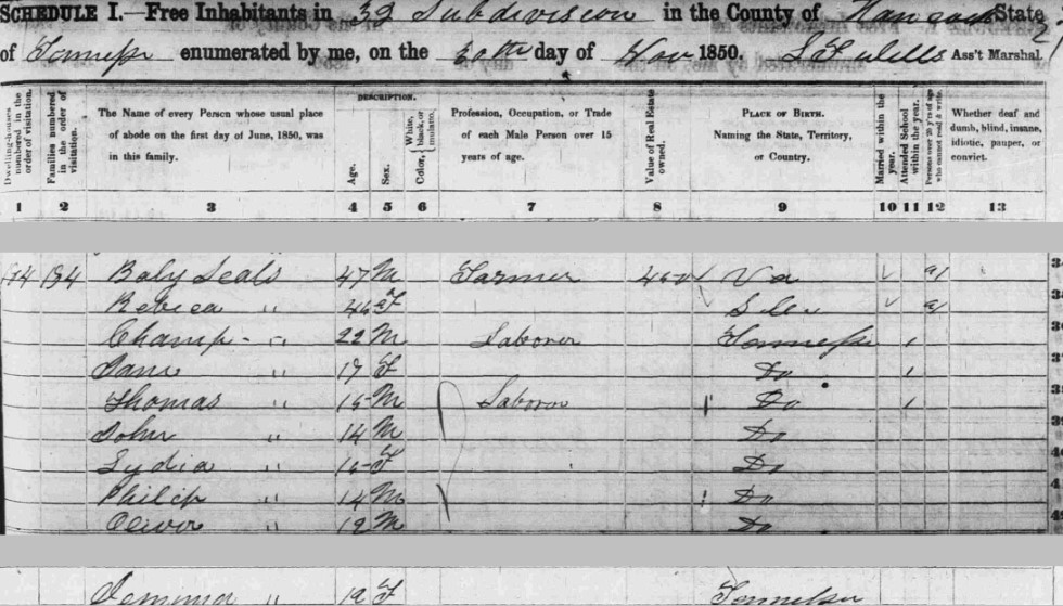 | William Seal Jrn | 42 | M | farming | $850 | $300 | Tennessee | ||