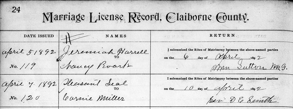 m2. Martha (Mattie) Monk on Nov. 18, 1891 in Claiborne Co., Tenn. - Ambrose Seals, b. 1869, m. Mary Cobb or Roe.