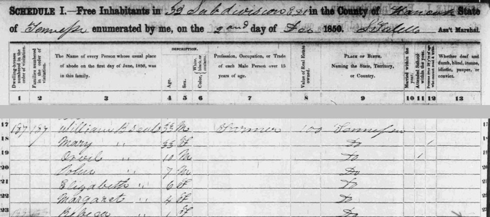The 1850 census shows the following children living in the Billy and Mary Seals household. The census record indicates that William B. Seals was born in Tennessee. This may be an indication that his father, Bailey Seals, moved to Tennessee before 1817. However, if he was brought to Tennessee at a very young age, he might not have considered that he was born in Virginia.