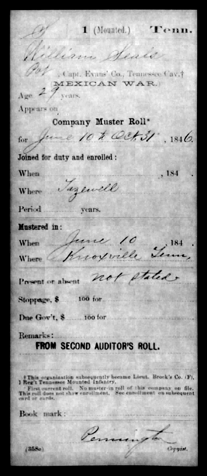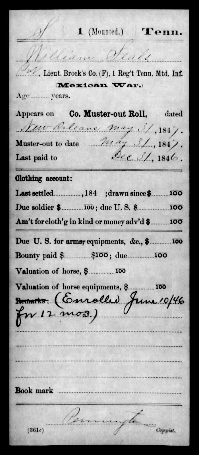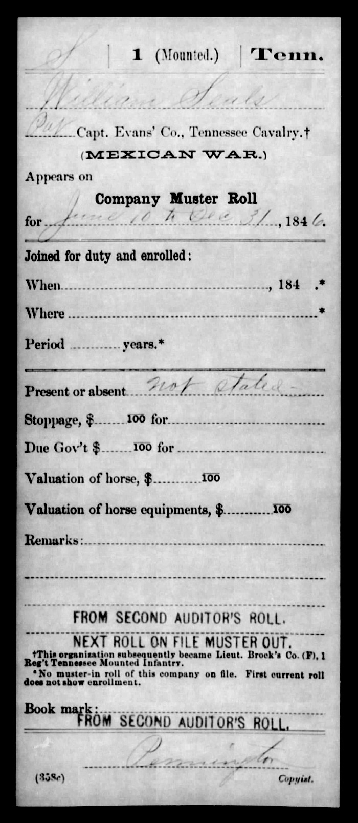 On May 13, 1846, Congress declared war on Mexico and authorized each State to enroll volunteers to dramatically expand the ranks of its small peacetime army. Tennessee's quota was 2800 volunteers; however, 30,000 Tennesseans responded to the call. To meet its initial quota of 2800 soldiers, Tennessee organized two infantry regiments and one mounted infantry (cavalry) regiment. William Seals was one of the first to volunteer and he joined Company F of the 1st Tennessee Mounted Infantry. According to his service records, he was 29 years old at the time of his enrollment in Tazewell, Tenn.; he was mustered in at Knoxville, Tenn. on June 10, 1846.