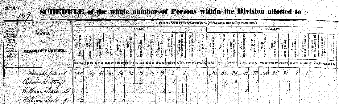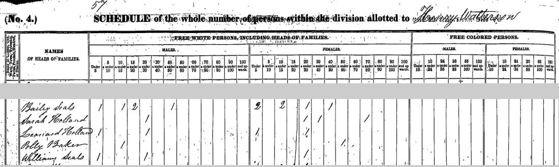 It is likely that William Seals, Jr. and Bailey Seals moved to Tennessee before 1820. They do not show up in the 1820 census for Virginia and, unfortunately, the census records for the eastern counties of Tennessee have been lost. However, William Seals, Jr. and his son William appear in the 1830 census in Claiborne Co., Tenn. and Noel Seals and Bailey Seals appear in the 1830 census in Hawkins Co., Tenn. As noted in the previous paragraph, because they lived near the borders of these two counties, they probably did not live very far apart. As indicated in the 1840 census, Bailey Seals and his son William B. Seals lived near each other in Hawkins Co., Tenn.