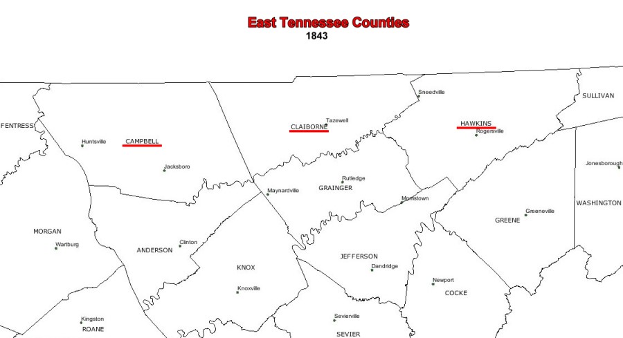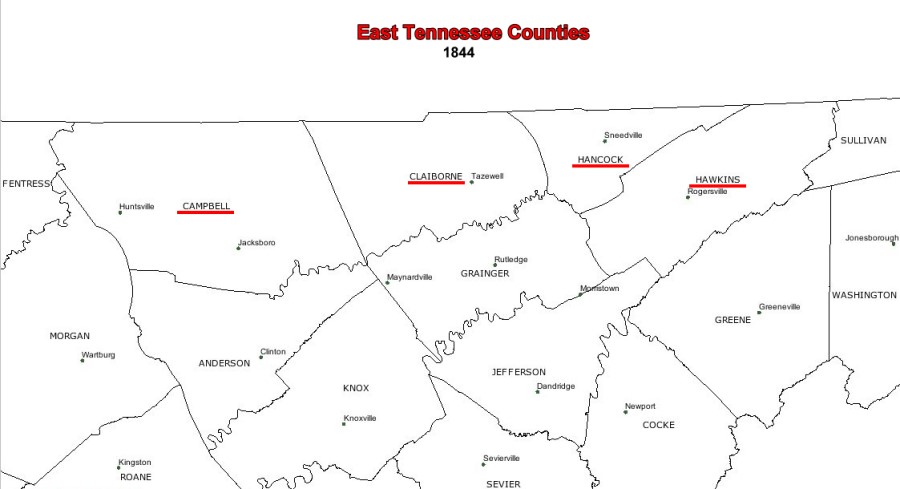William Seale probably died around 1815 in Pittsylvania Co., Va. Around that time, several of his children began to migrate to northeastern Tennessee. In the years that followed, the Seals families variously lived in Hawkins Co., Claiborne Co., and finally Hancock Co., Tenn. However, most of the families likely lived close to Sneedville, Tenn. in the Clinch River Valley, an area which straddled the border between Hawkins Co. (formed in 1787) and Claiborne Co. (formed in 1801), before it became Hancock Co. which was formed in 1844. Click on the image on the right to see the borders of these counties before and after 1844.