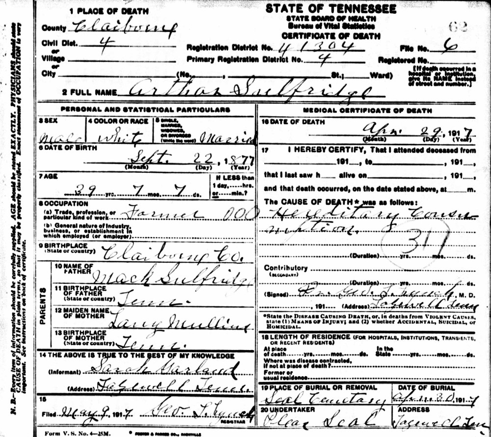 - the 1917 death certificate for Arthur Sulfridge which indicated his father's name was Mack Sulfridge.