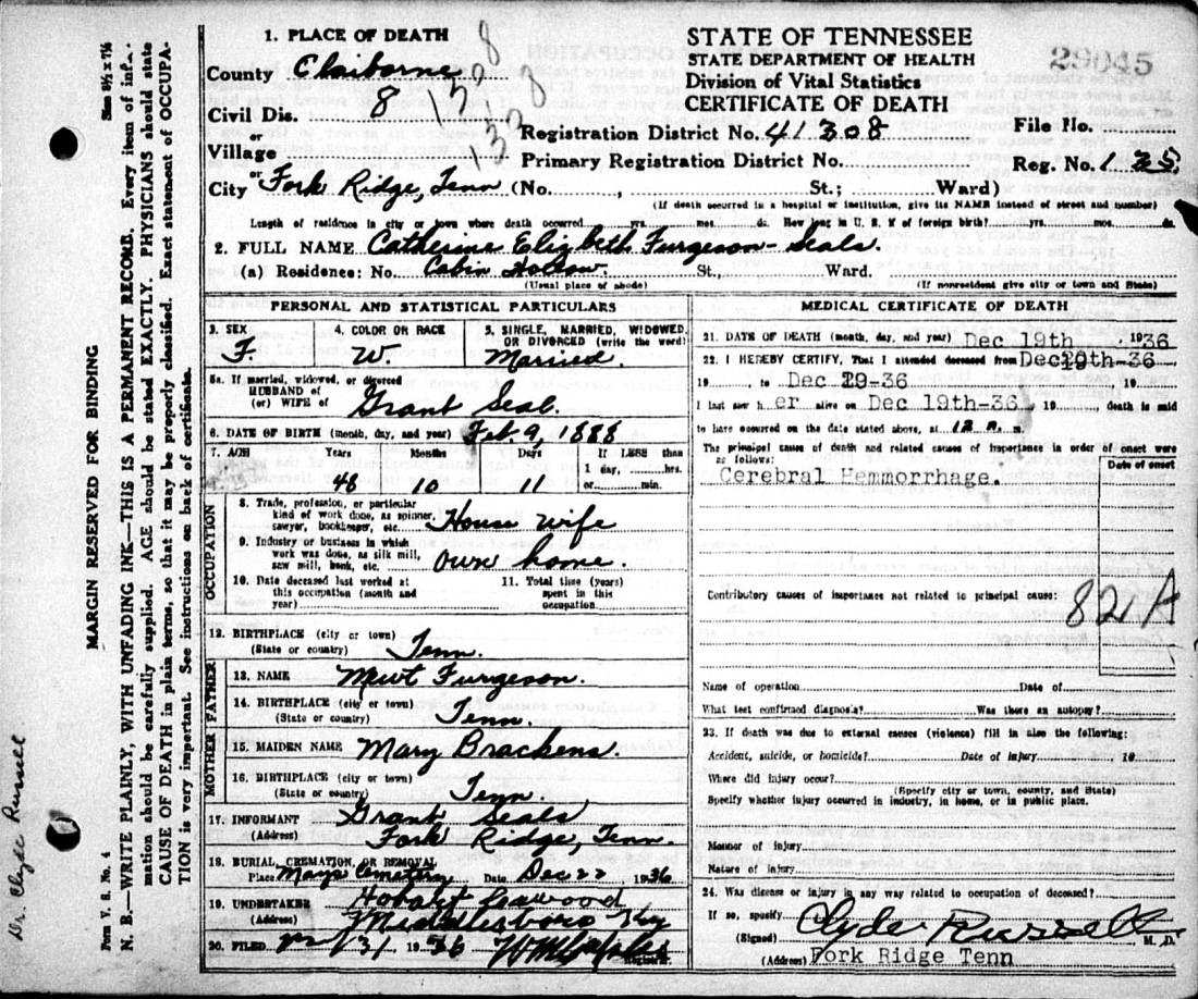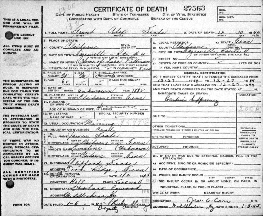 - Grant Alex Seal, b. Mar. 20, 1882 in Claiborne Co., Tenn, m. Catherine Elizabeth Ferguson (see Catherine Seals's death certificate), d. Dec. 30, 1944 in Claiborne Co., Tenn. (see death certificate)