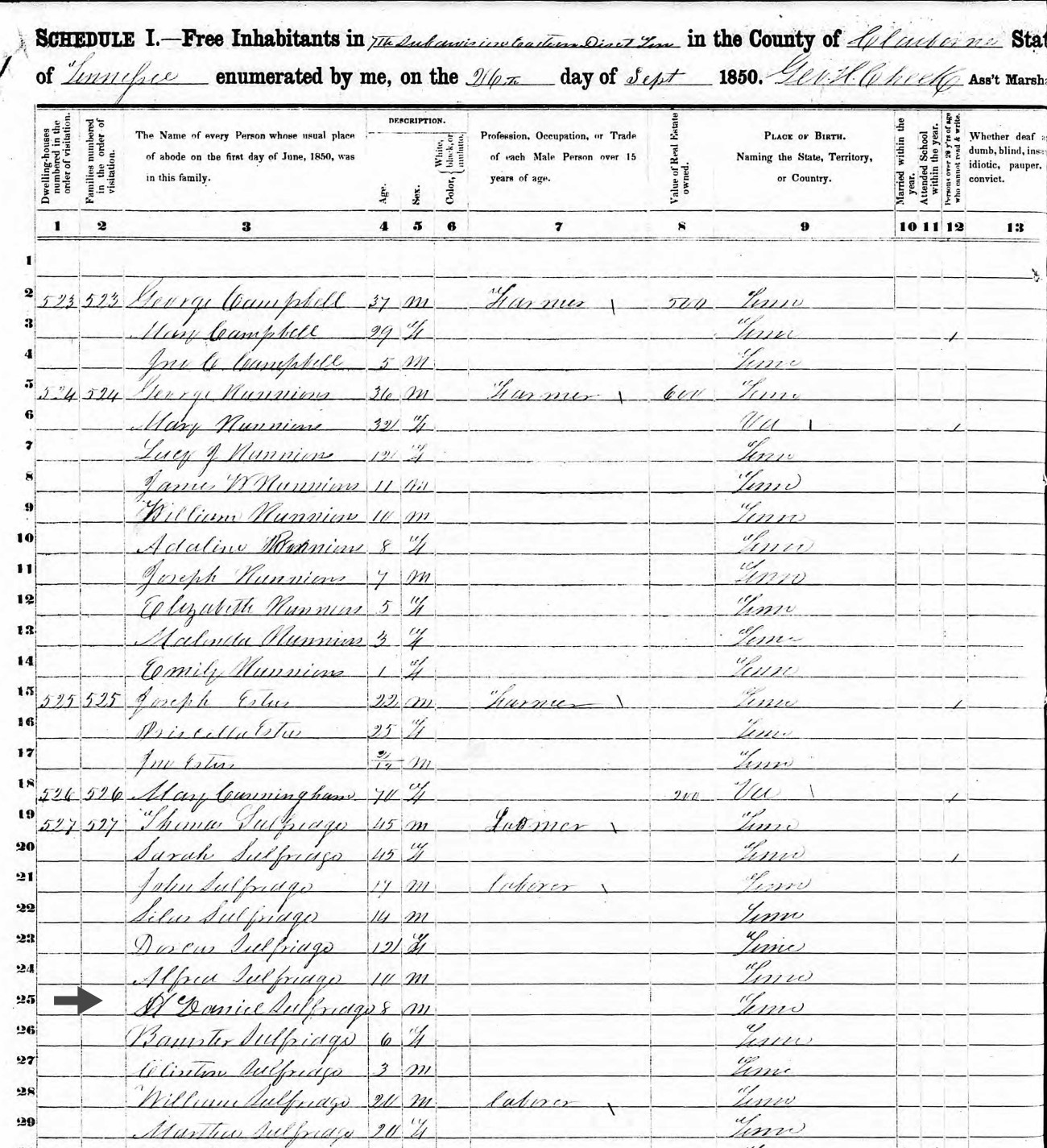 - an 1850 census record which indicates that McDaniel Sulfridge was born to Thomas and Sarah Sulfridge around 1842 (it appears the enumerator started to write the "D" for Daniel, then changed it to an "M" and added a superscript "c" followed by "Daniel." The "D" in Daniel is not written in the same style as other D's which suggests the flourish at the top of the "D" is really a "c.")