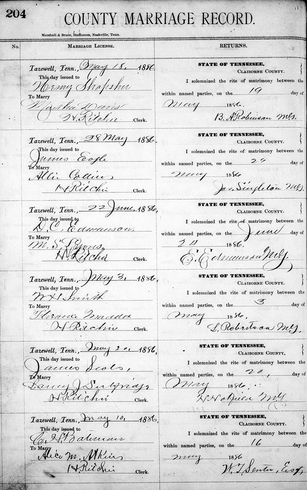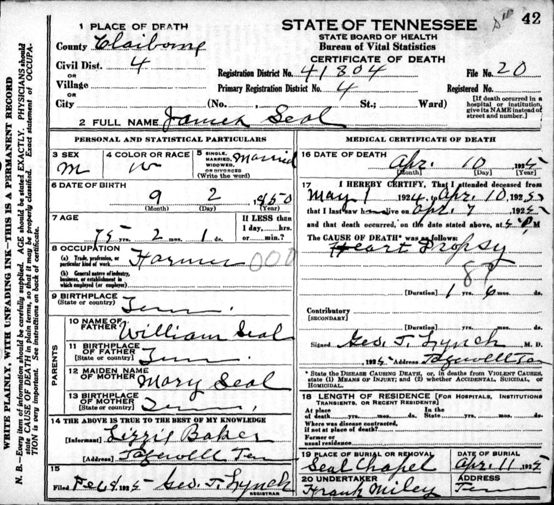 - Maude Seal, b. Feb. 1887, m. Pleasant Seal, d. Jan. 9, 1925 in Claiborne Co., Tenn. (see death certificate)