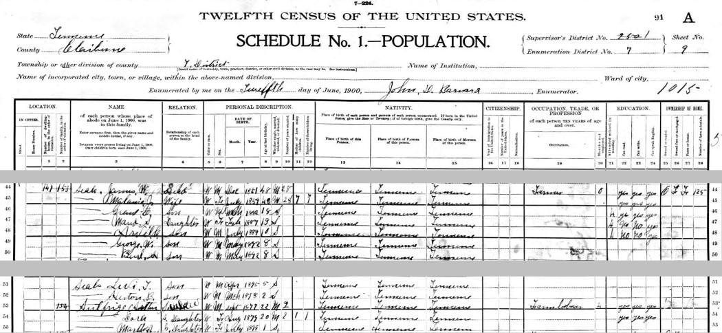 The 1900 census indicated that James W. and Laney Jane Seals were living in Claiborne Co., Tenn. with their six children; also living with them were Grant Seal, son of James W. Seal and Emily Bird, and Arthur Sulfridge, Laney Jane's son by McDaniel (Mack) Sulfridge, and Arthur's wife and child. The enumerator indicated that Arthur's relationship to the head of the family was "son-in-law." Arthur would have been James W. Seals's stepson. Census and legal records often used the terms son-in-law and stepson interchangeably, particularly before the 20th century. Laney's name was spelled "Malanie" by the enumerator who also indicated the Seals had been married for 28 years. He was probably counting from the date of James W. Seal's first marriage to Emily Bird. In reality, James W. and Laney J. Seals had been married for fourteen years by 1900.