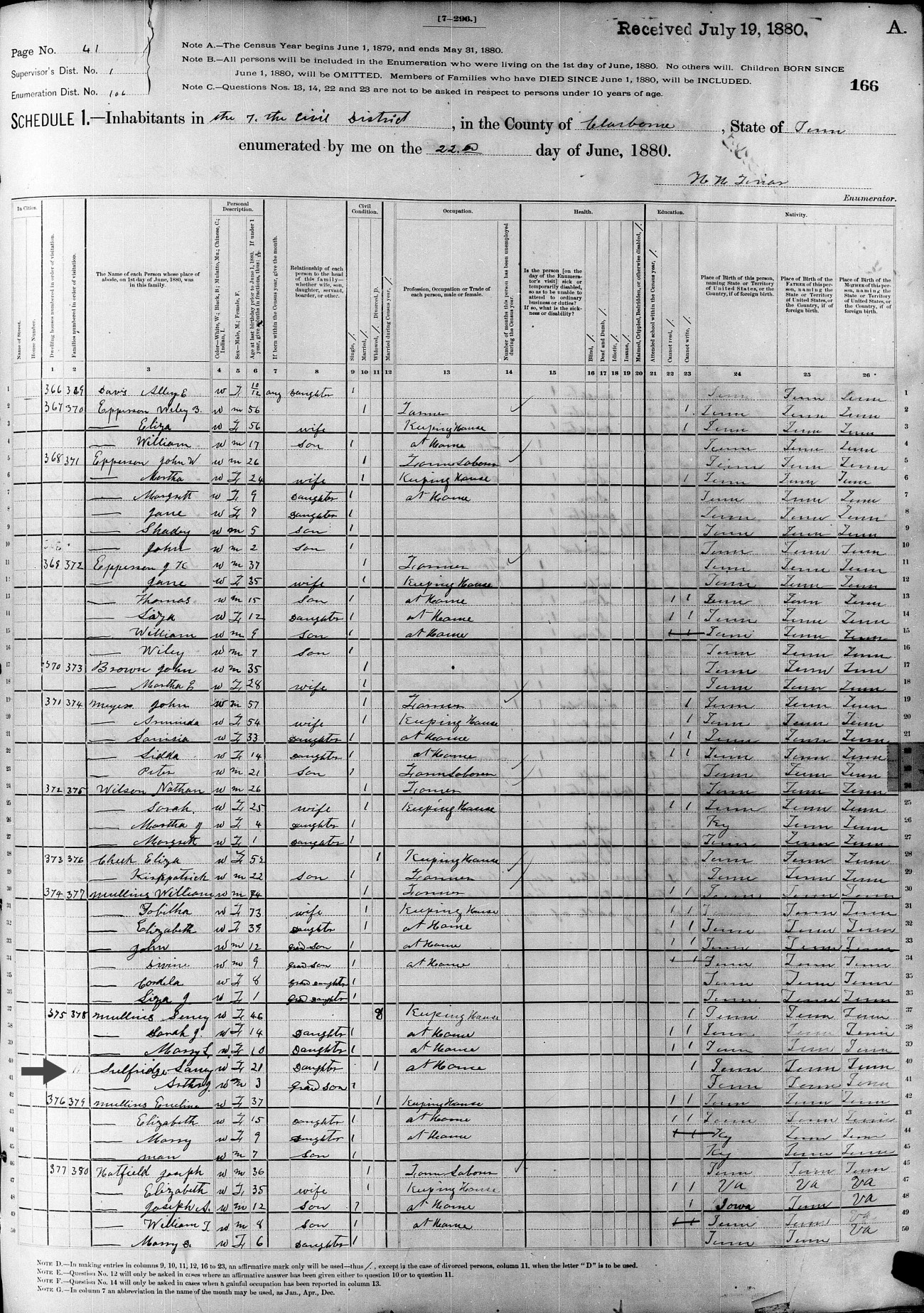| Dora Sulfrige | S. Daughter | F | August 1879 | Tennessee | Yes | Yes | |